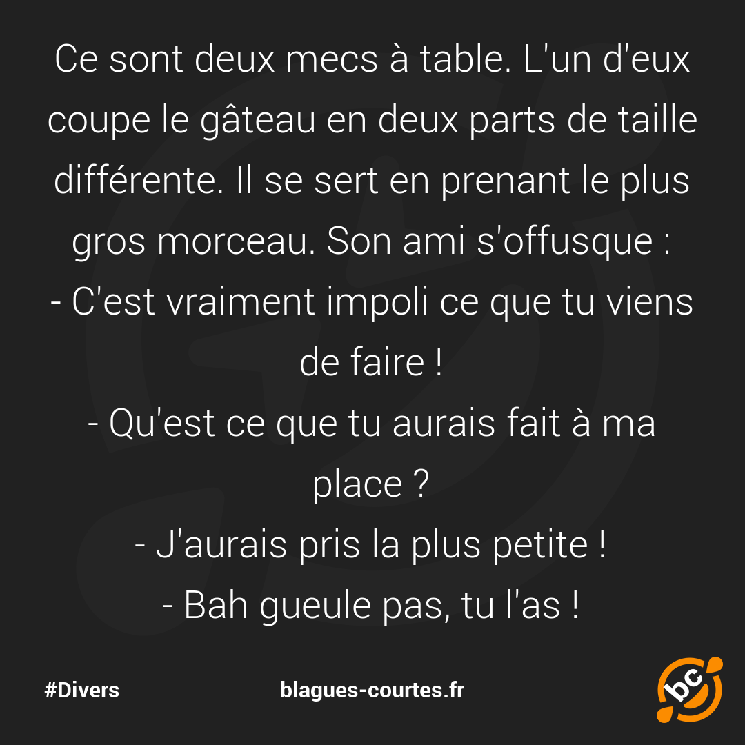 Ce sont deux mecs à table. L'un d'eux coupe le gâteau en deux parts de taille différente. Il se sert en prenant le plus gros morceau. Son ami s'offusque :