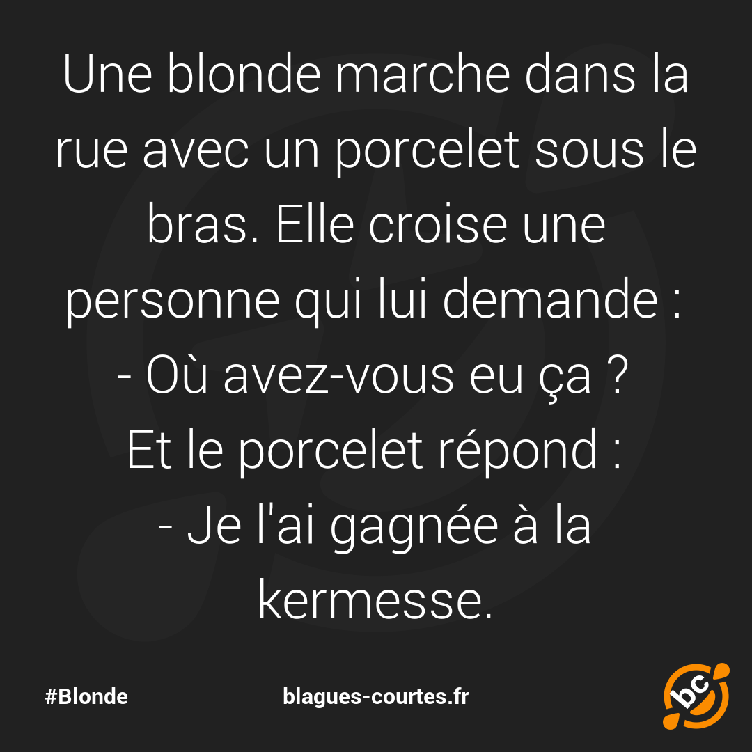 Une blonde marche dans la rue avec un porcelet sous le bras. Elle croise une personne qui lui demande :