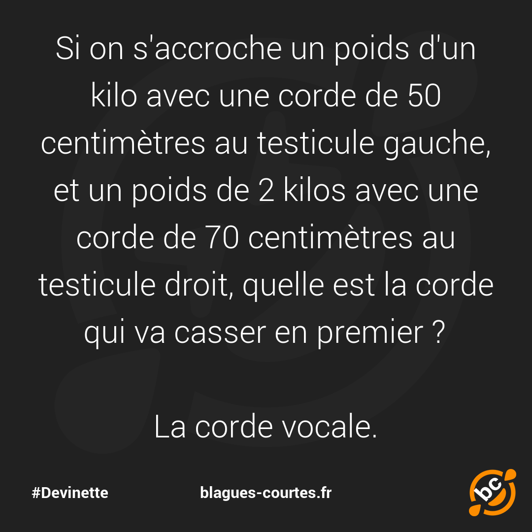 Si on s'accroche un poids d'un kilo avec une corde de 50 centimètres au testicule gauche, et un poids de 2 kilos avec une corde de 70 centimètres au testicule droit, quelle est la corde qui va casser en premier ?