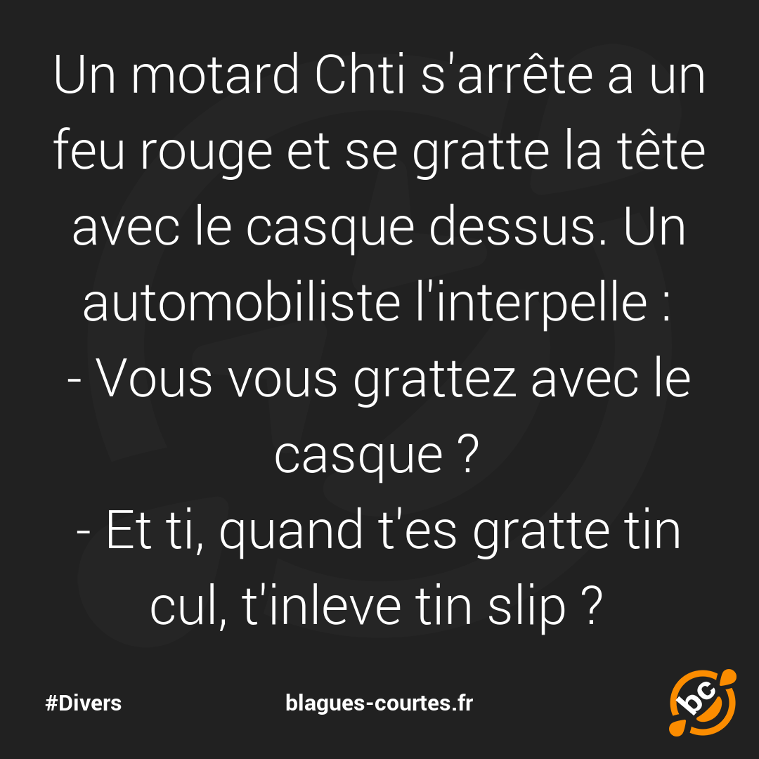 Un motard Chti s'arrête a un feu rouge et se gratte la tête avec le casque dessus. Un automobiliste l'interpelle :