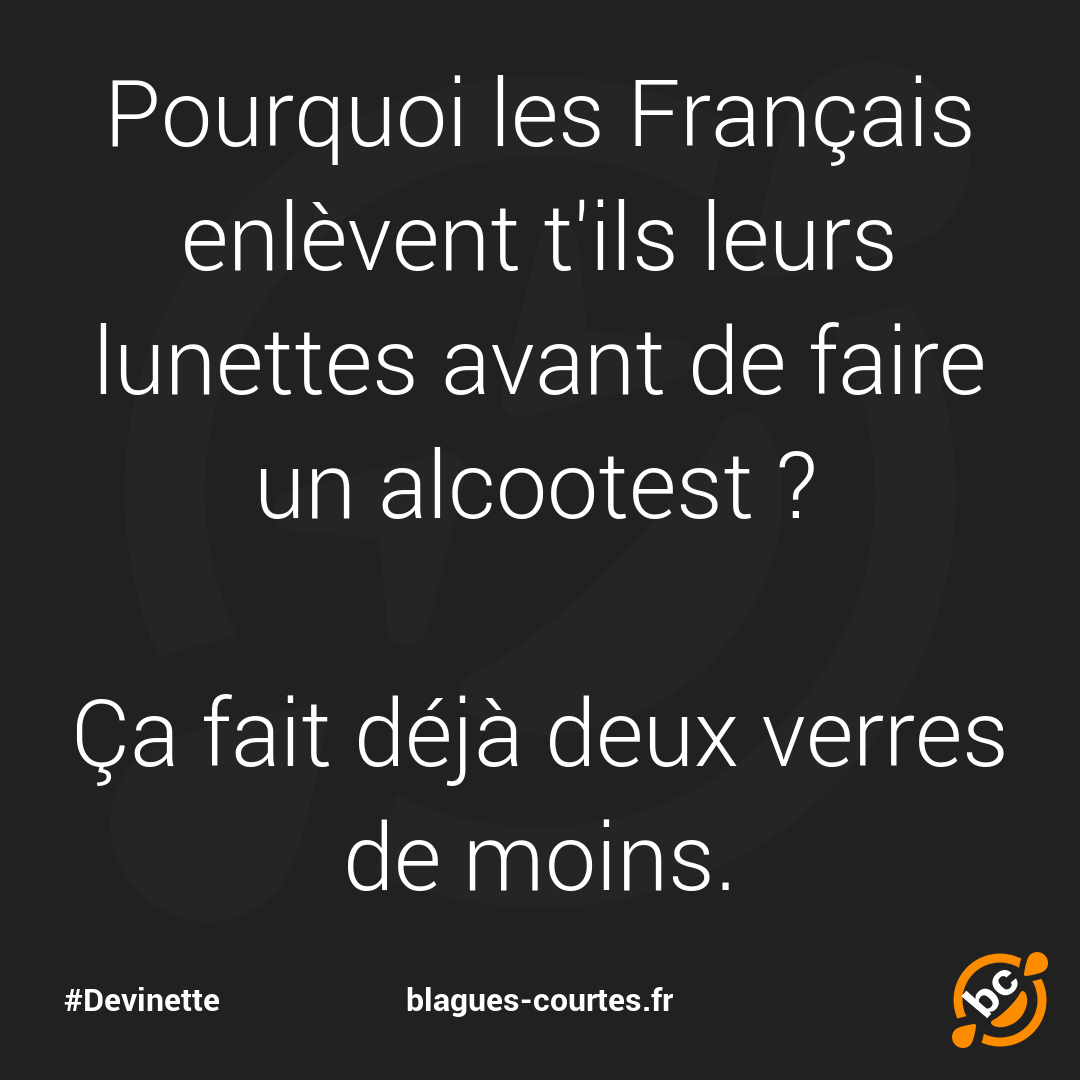 Pourquoi les Français enlèvent t'ils leurs lunettes avant de faire un alcootest ? Ça fait déjà deux verres de moins.