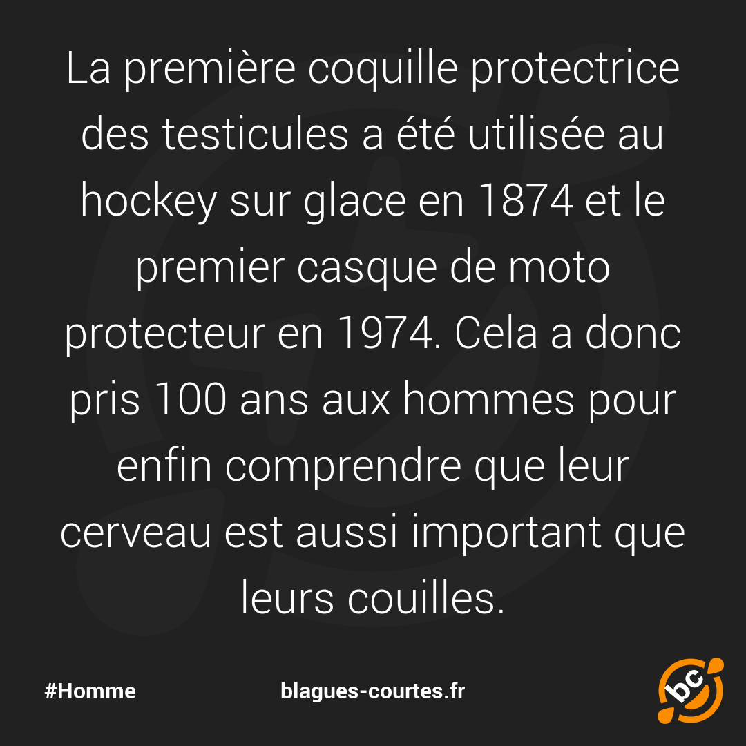 La première coquille protectrice des testicules a été utilisée au hockey sur glace en 1874 et le premier casque de moto protecteur en 1974. Cela a donc pris 100 ans aux hommes pour enfin comprendre que leur cerveau est aussi important que leurs couilles.
