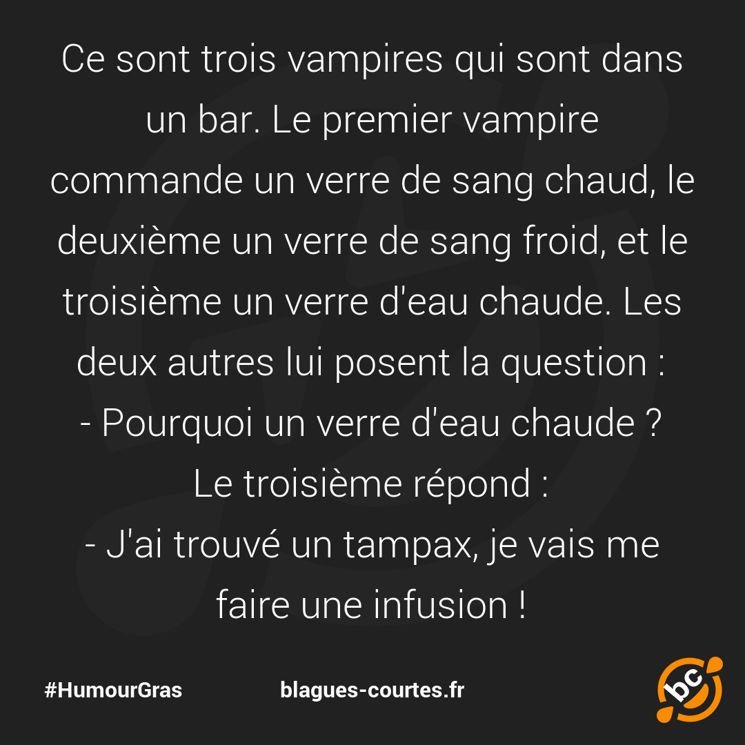 Ce sont trois vampires qui sont dans un bar. Le premier vampire commande un verre de sang chaud, le deuxième un verre de sang froid, et le troisième un verre d'eau chaude. Les deux autres lui posent la question :