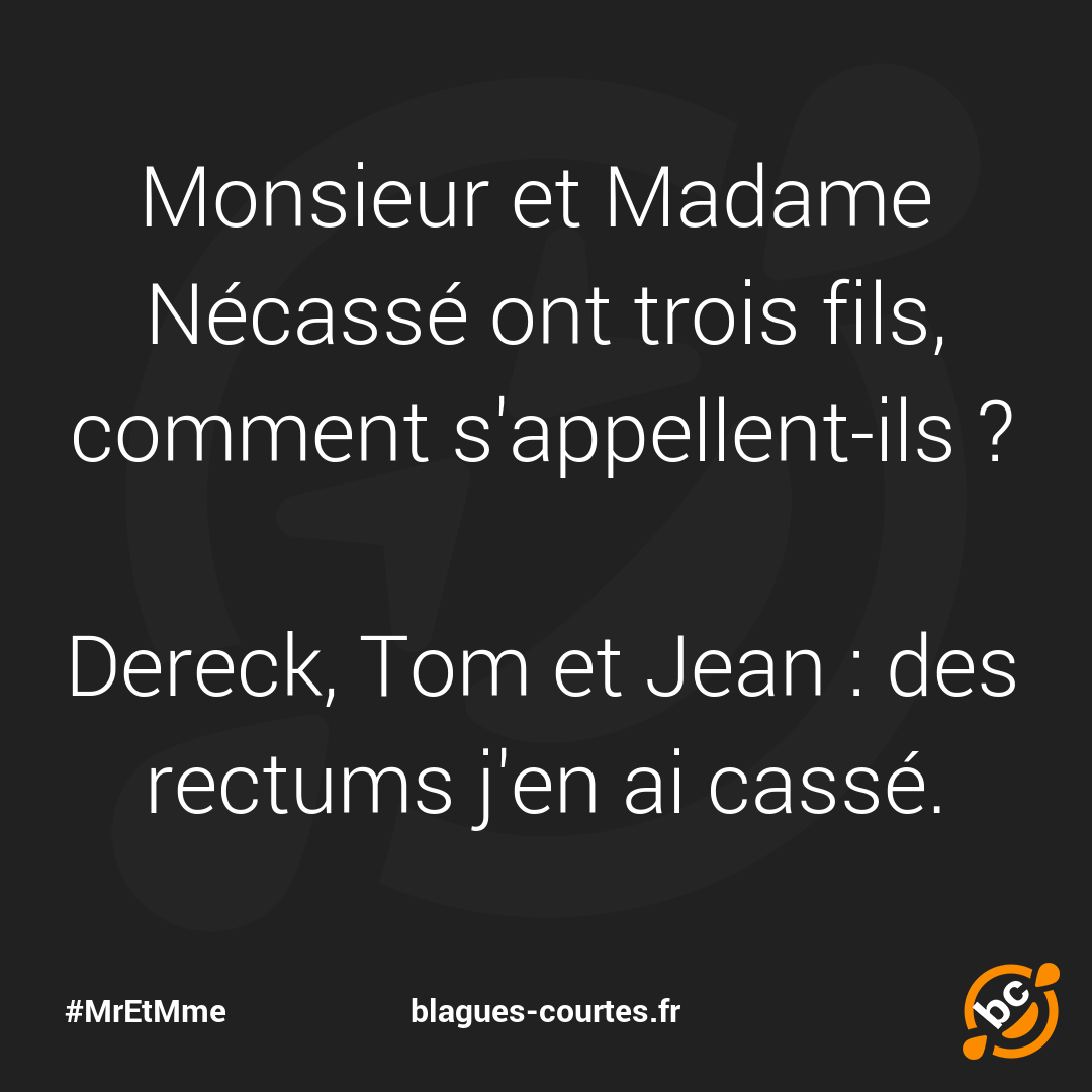 Monsieur et Madame Nécassé ont trois fils, comment s'appellent-ils ? Dereck, Tom et Jean : des rectums j'en ai cassé.