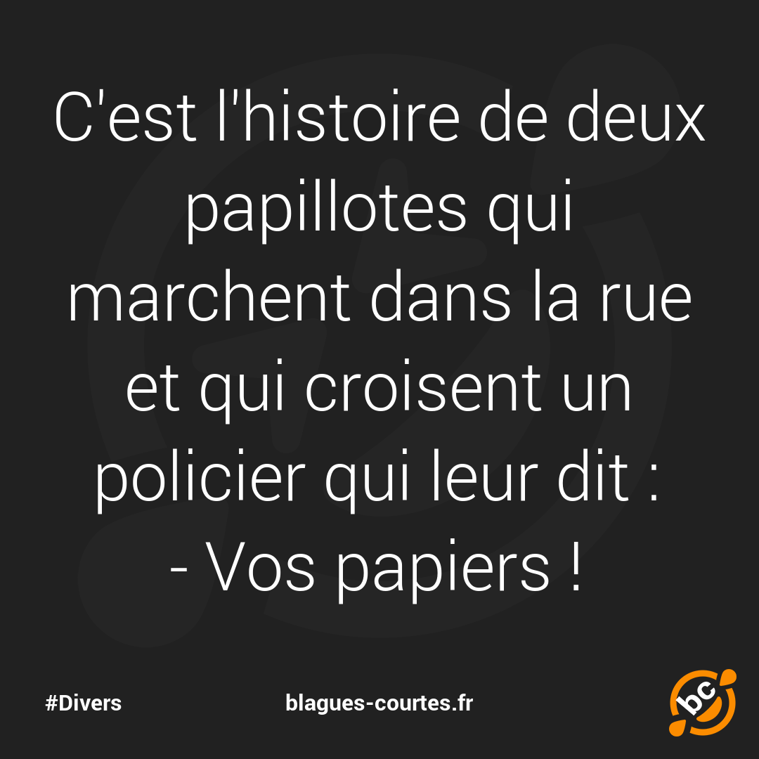C'est l'histoire de deux papillotes qui marchent dans la rue et qui croisent un policier qui leur dit : - Vos papiers !