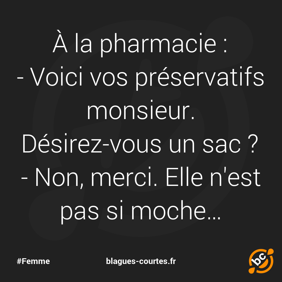 À la pharmacie : - Voici vos préservatifs monsieur. Désirez-vous un sac ? - Non, merci. Elle n'est pas si moche…