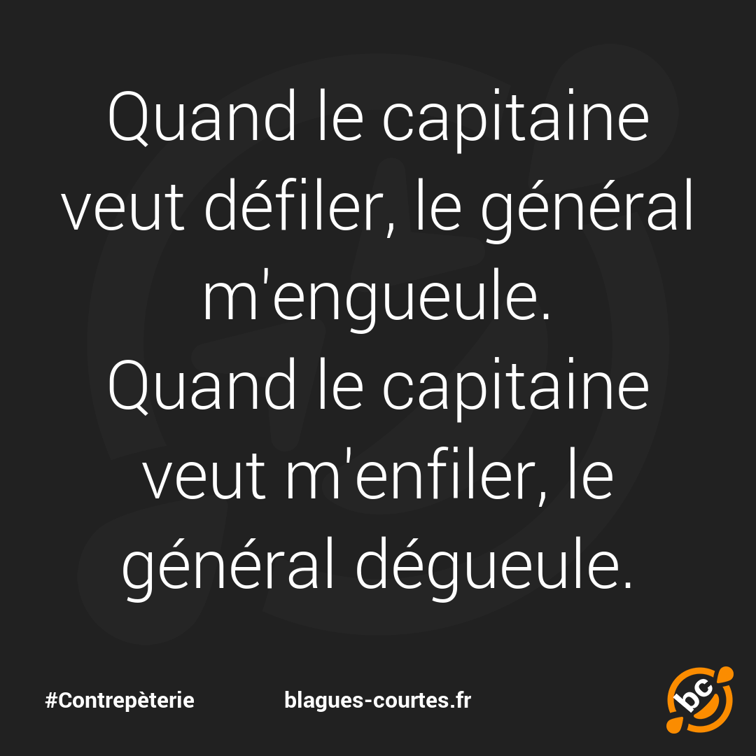 Quand le capitaine veut défiler, le général m'engueule. Quand le capitaine veut m'enfiler, le général dégueule.