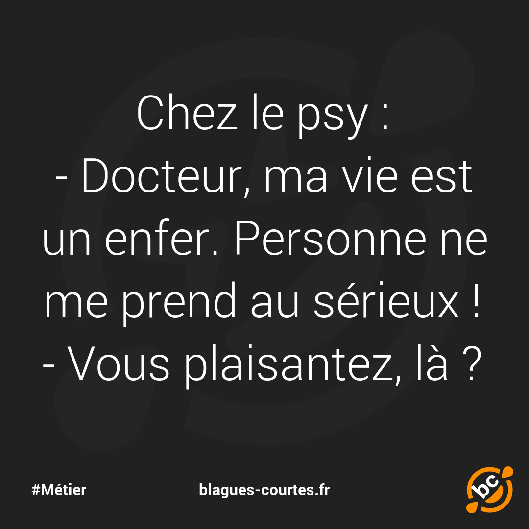 Chez le psy : - Docteur, ma vie est un enfer. Personne ne me prend au sérieux ! - Vous plaisantez, là ?