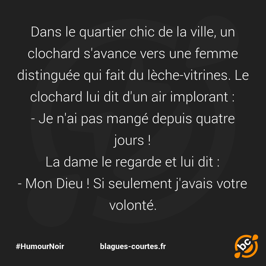 Dans le quartier chic de la ville, un clochard s'avance vers une femme distinguée qui fait du lèche-vitrines. Le clochard lui dit d'un air implorant :