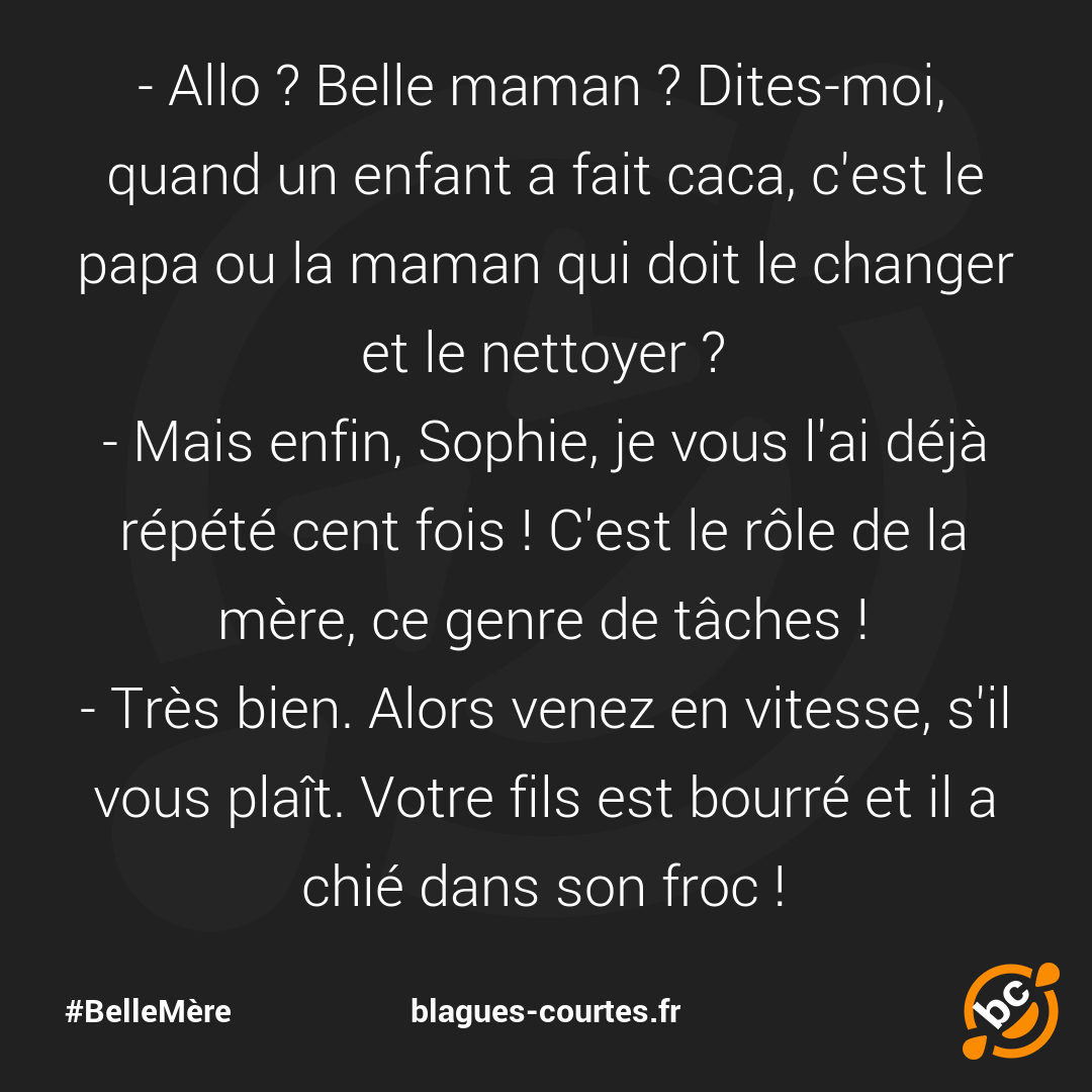 - Allo ? Belle maman ? Dites-moi, quand un enfant a fait caca, c'est le papa ou la maman qui doit le changer et le nettoyer ?