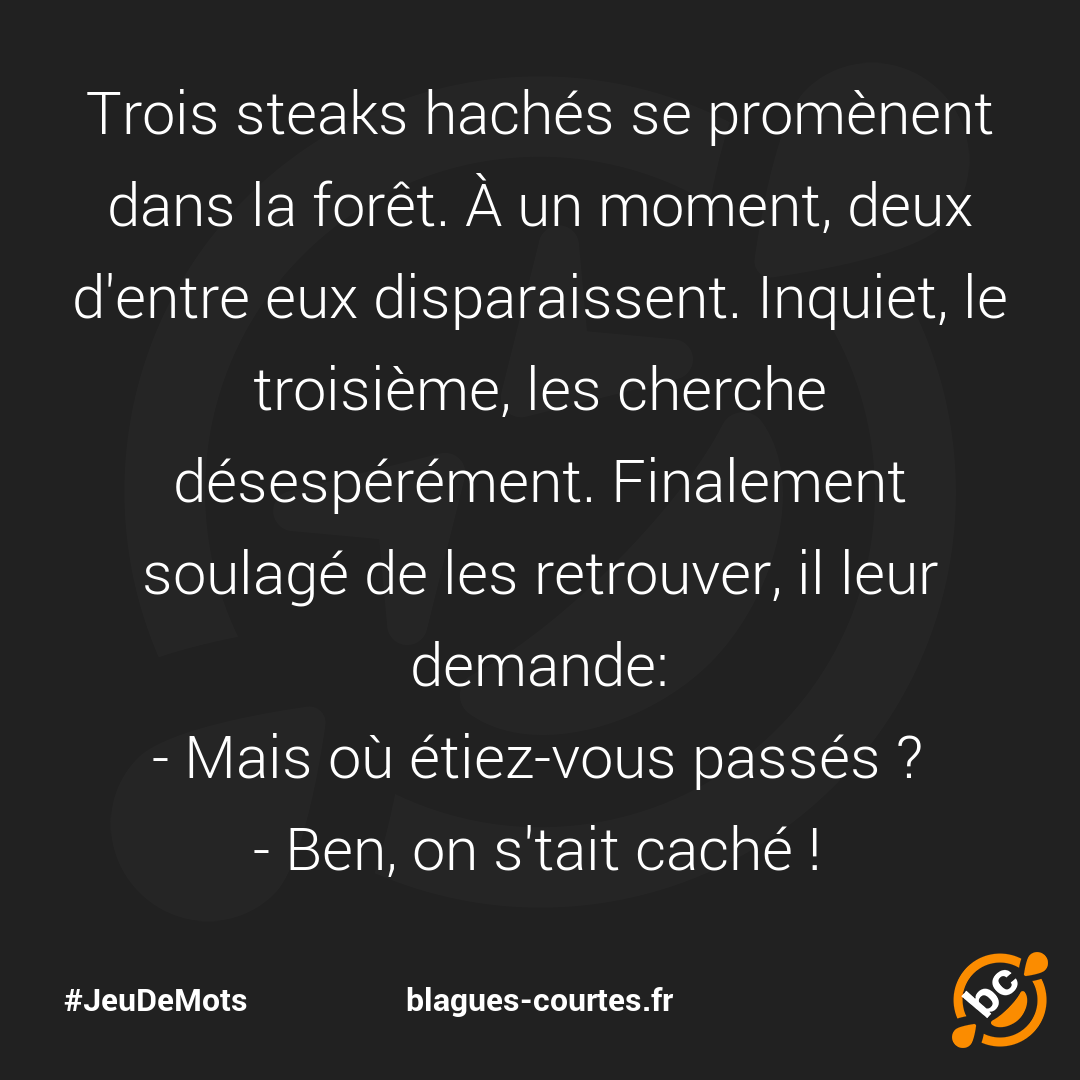 Trois steaks hachés se promènent dans la forêt. À un moment, deux d'entre eux disparaissent. Inquiet, le troisième, les cherche désespérément. Finalement soulagé de les retrouver, il leur demande: