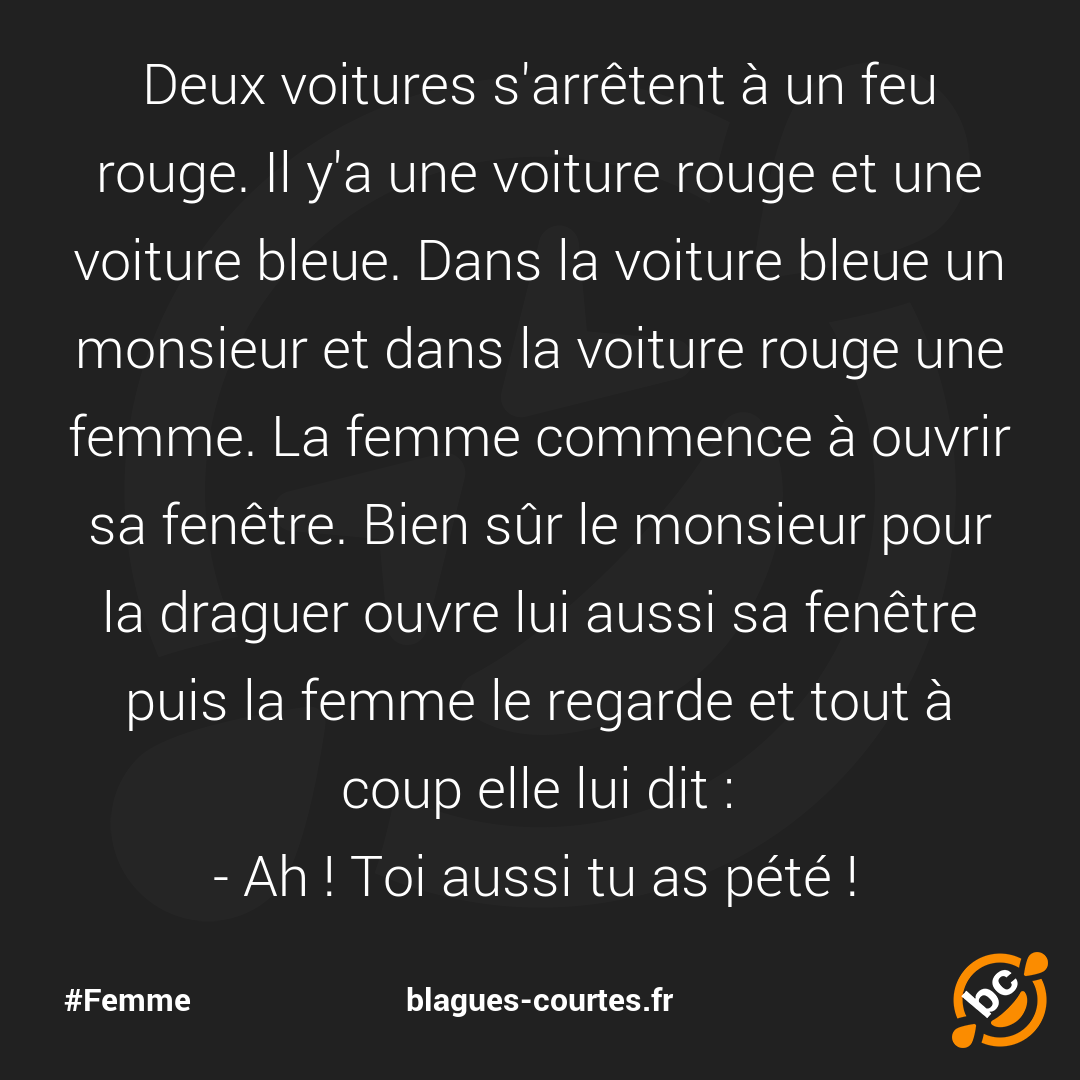Deux voitures s'arrêtent à un feu rouge. Il y'a une voiture rouge et une voiture bleue. Dans la voiture bleue un monsieur et dans la voiture rouge une femme. La femme commence à ouvrir sa fenêtre. Bien sûr le monsieur pour la draguer ouvre lui aussi sa fenêtre puis la femme le regarde et tout à coup elle lui dit :