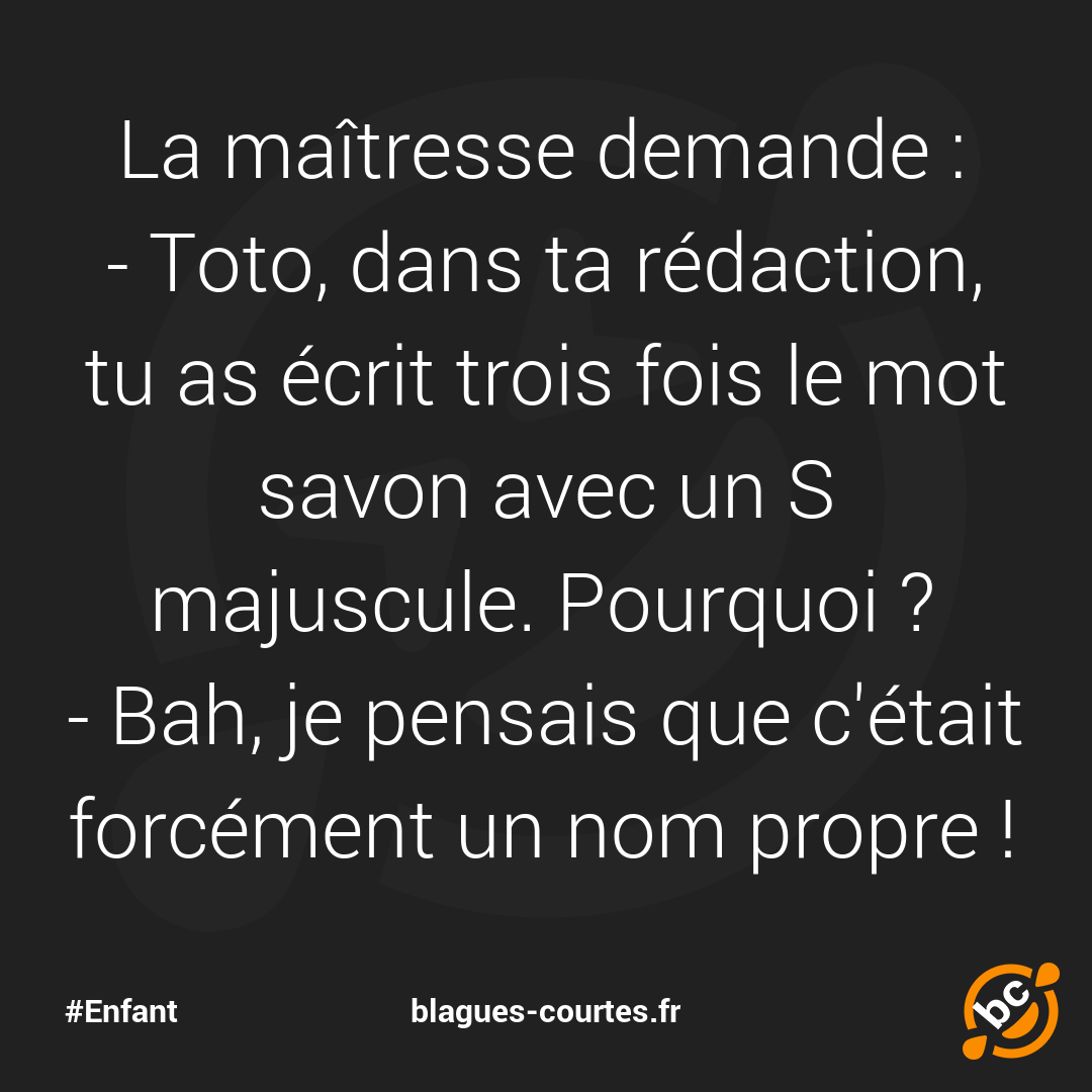 - Toto, dans ta rédaction, tu as écrit trois fois le mot savon avec un S majuscule. Pourquoi ?
