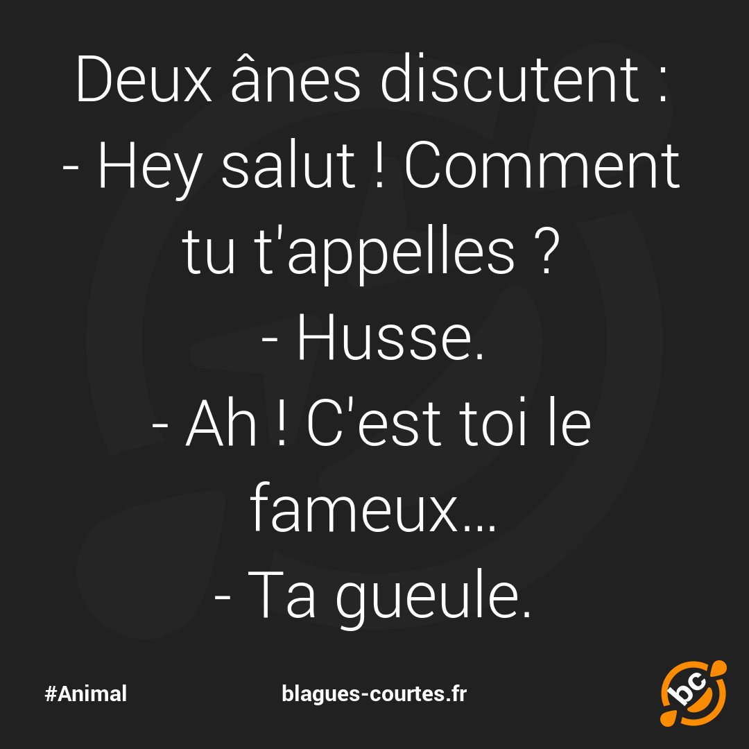 Deux ânes discutent : - Hey salut ! Comment tu t'appelles ? - Husse. - Ah ! C'est toi le fameux… - Ta gueule.