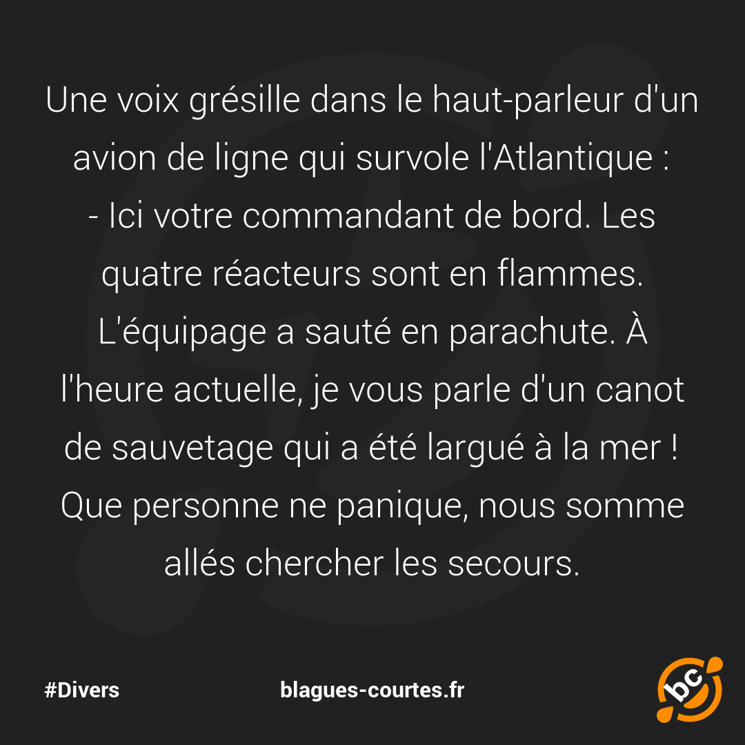 - Ici votre commandant de bord. Les quatre réacteurs sont en flammes. L'équipage a sauté en parachute. À l'heure actuelle, je vous parle d'un canot de sauvetage qui a été largué à la mer ! Que personne ne panique, nous somme allés chercher les secours.