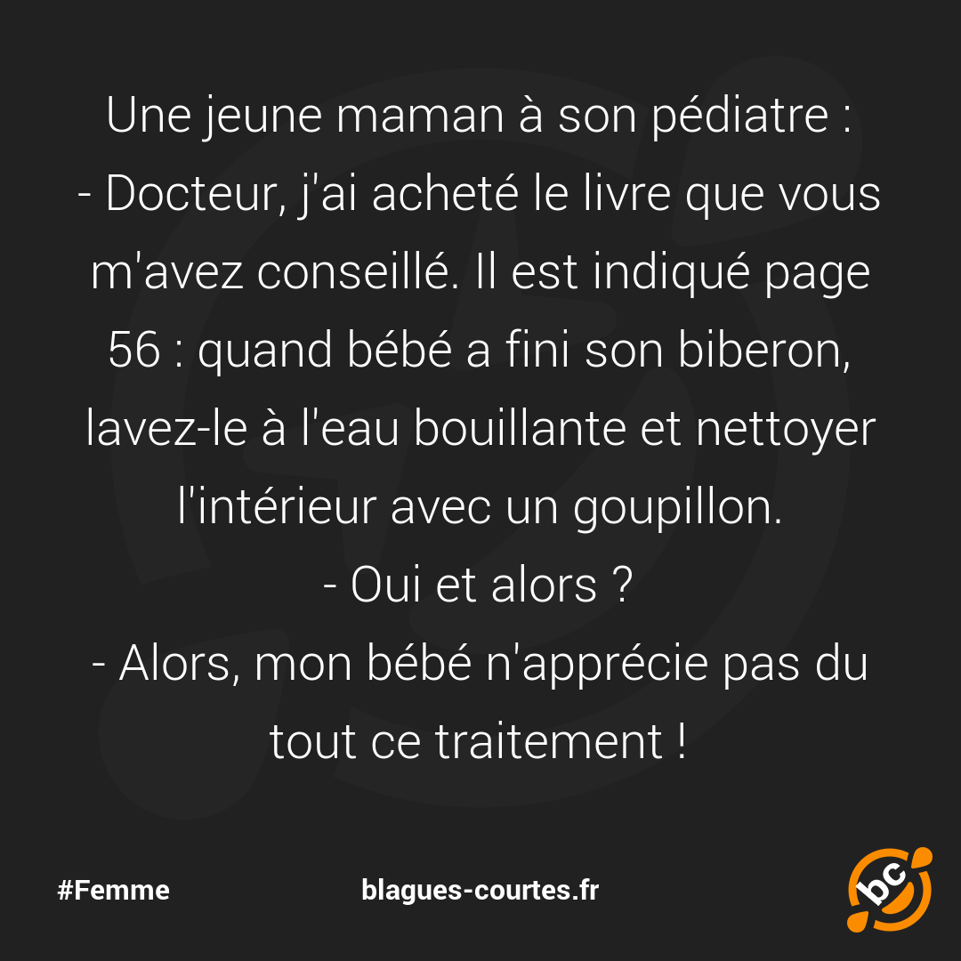 - Docteur, j'ai acheté le livre que vous m'avez conseillé. Il est indiqué page 56 : quand bébé a fini son biberon, lavez-le à l'eau bouillante et nettoyer l'intérieur avec un goupillon.