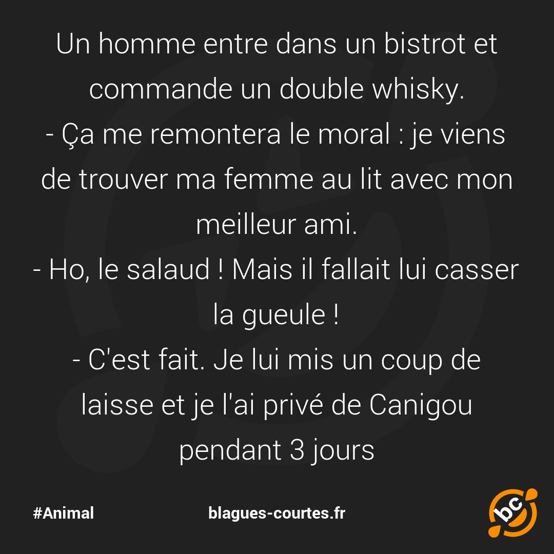 - Ça me remontera le moral : je viens de trouver ma femme au lit avec mon meilleur ami.