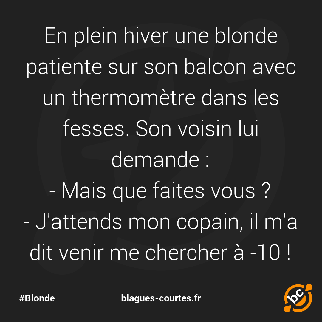 En plein hiver une blonde patiente sur son balcon avec un thermomètre dans les fesses. Son voisin lui demande :