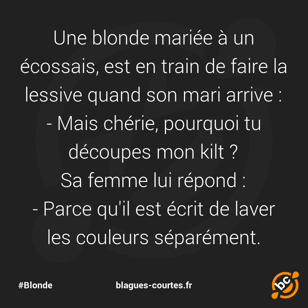 Une blonde mariée à un écossais, est en train de faire la lessive quand son mari arrive :