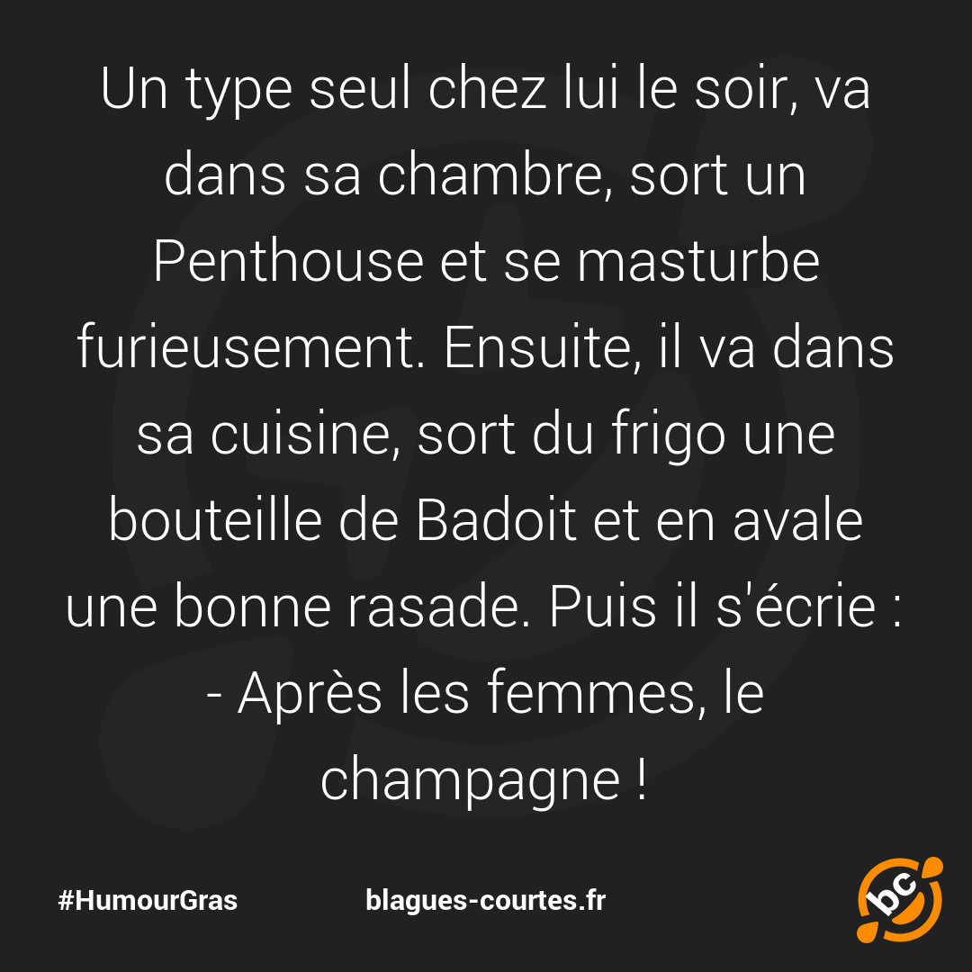 Un type seul chez lui le soir, va dans sa chambre, sort un Penthouse et se masturbe furieusement. Ensuite, il va dans sa cuisine, sort du frigo une bouteille de Badoit et en avale une bonne rasade. Puis il s'écrie :