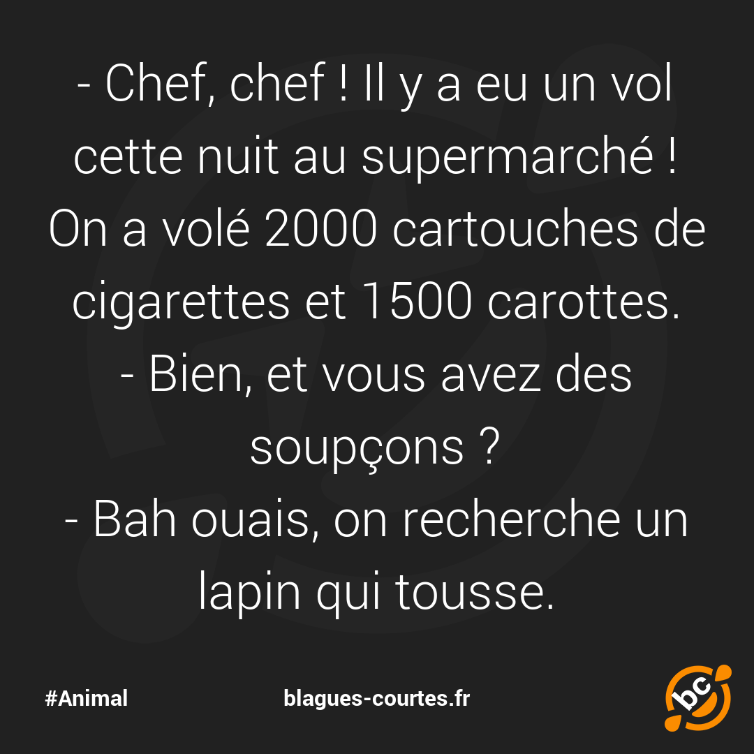 - Chef, chef ! Il y a eu un vol cette nuit au supermarché ! On a volé 2000 cartouches de cigarettes et 1500 carottes.