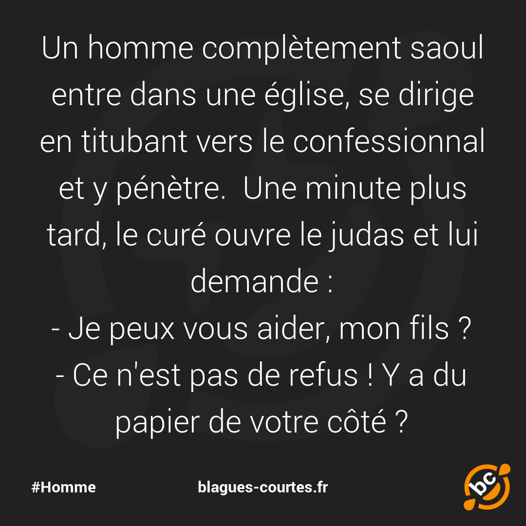 Un homme complètement saoul entre dans une église, se dirige en titubant vers le confessionnal et y pénètre. Une minute plus tard, le curé ouvre le judas et lui demande :