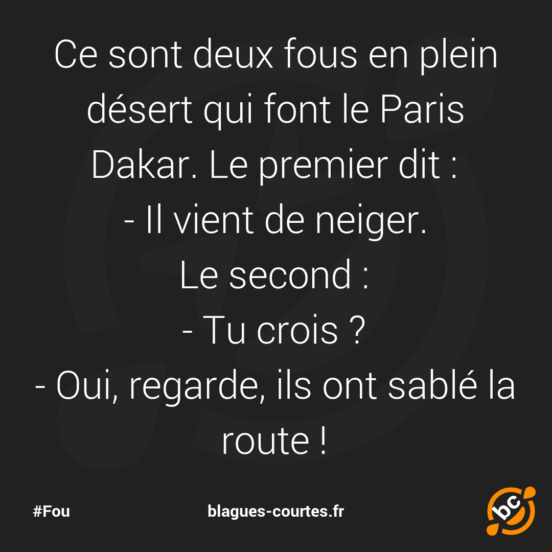 Ce sont deux fous en plein désert qui font le Paris Dakar. Le premier dit :