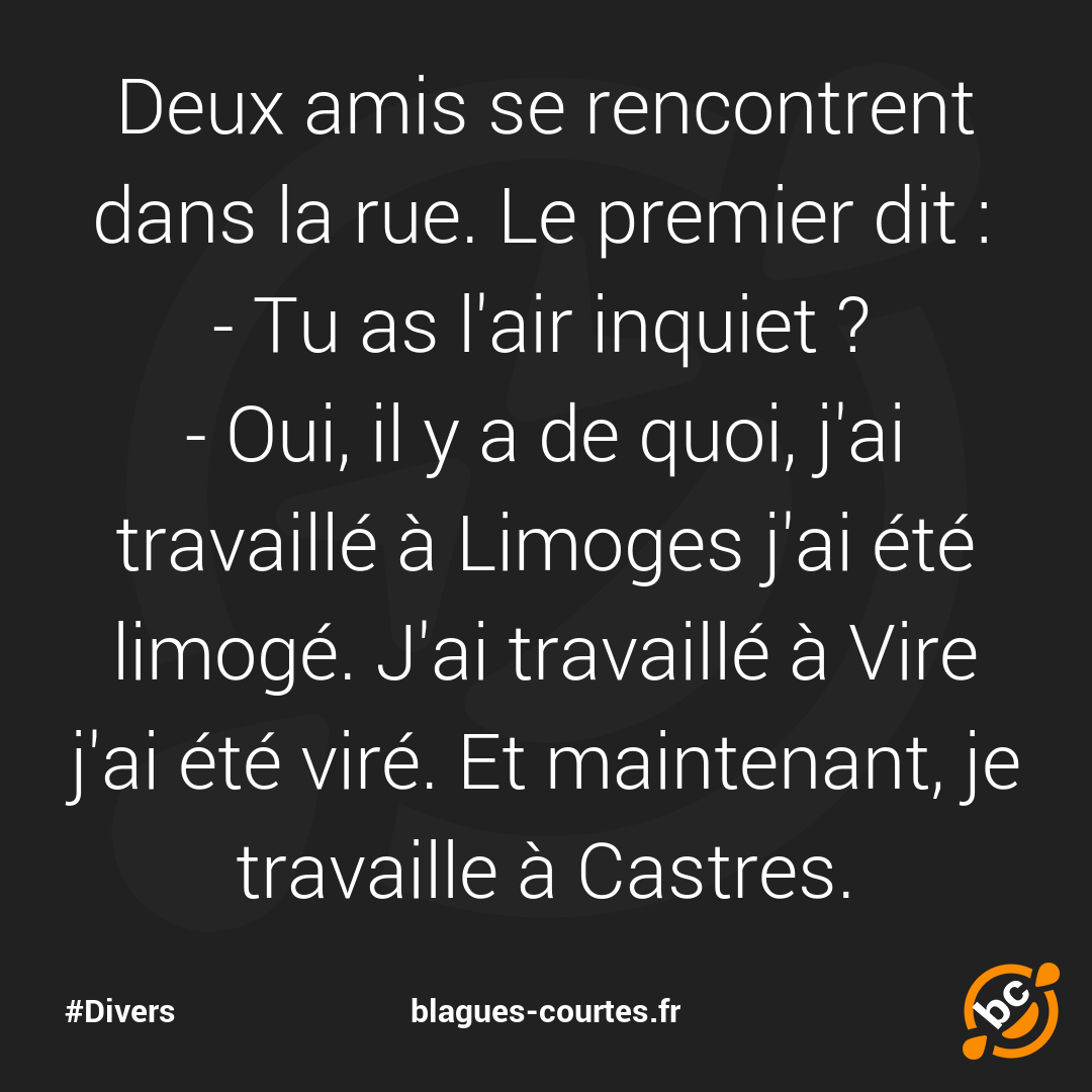 - Oui, il y a de quoi, j'ai travaillé à Limoges j'ai été limogé. J'ai travaillé à Vire j'ai été viré. Et maintenant, je travaille à Castres.
