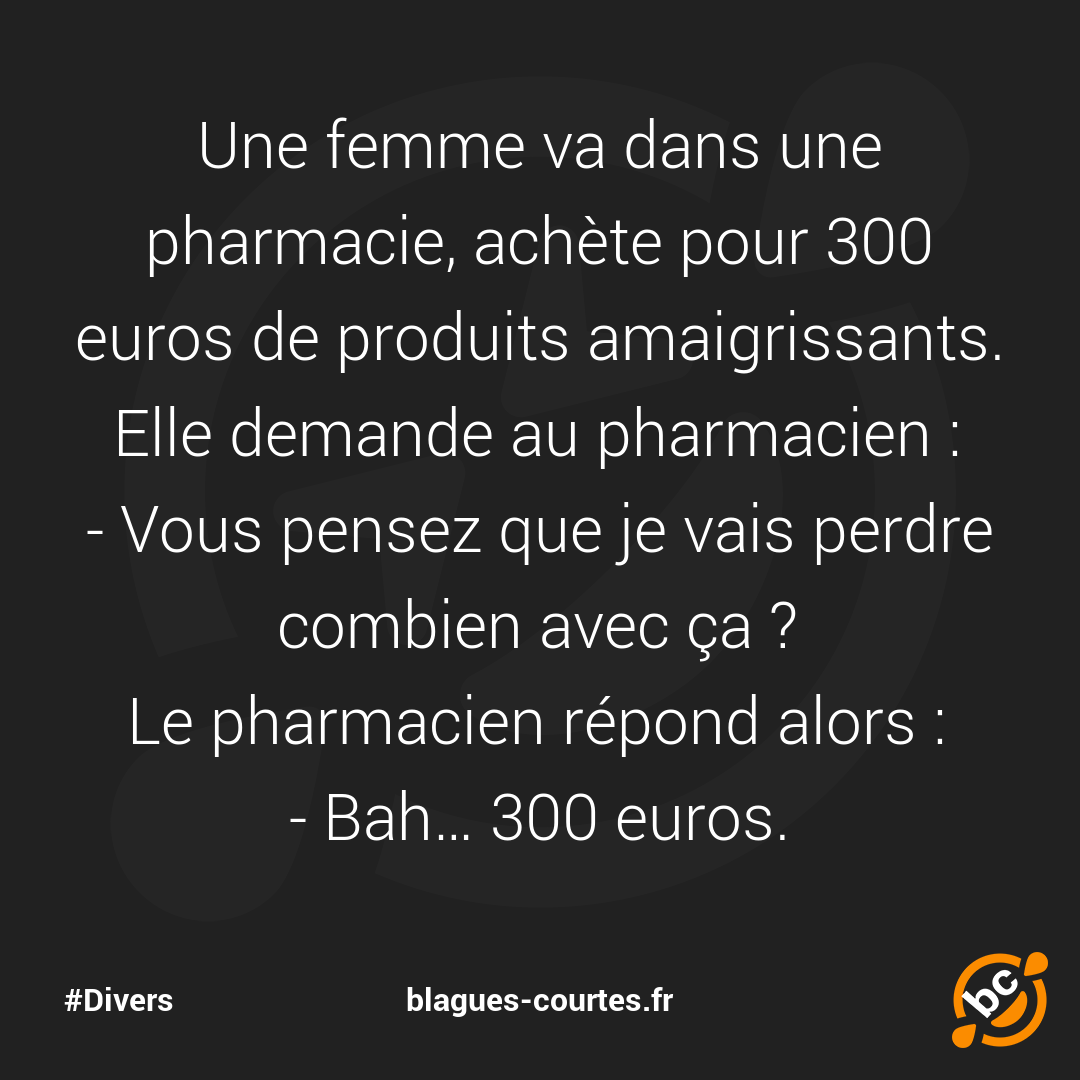 Une femme va dans une pharmacie, achète pour 300 euros de produits amaigrissants. Elle demande au pharmacien :