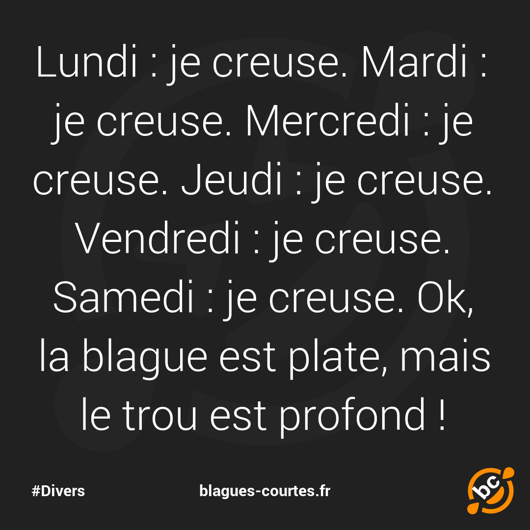 Lundi : je creuse. Mardi : je creuse. Mercredi : je creuse. Jeudi : je creuse. Vendredi : je creuse. Samedi : je creuse. Ok, la blague est plate, mais le trou est profond !
