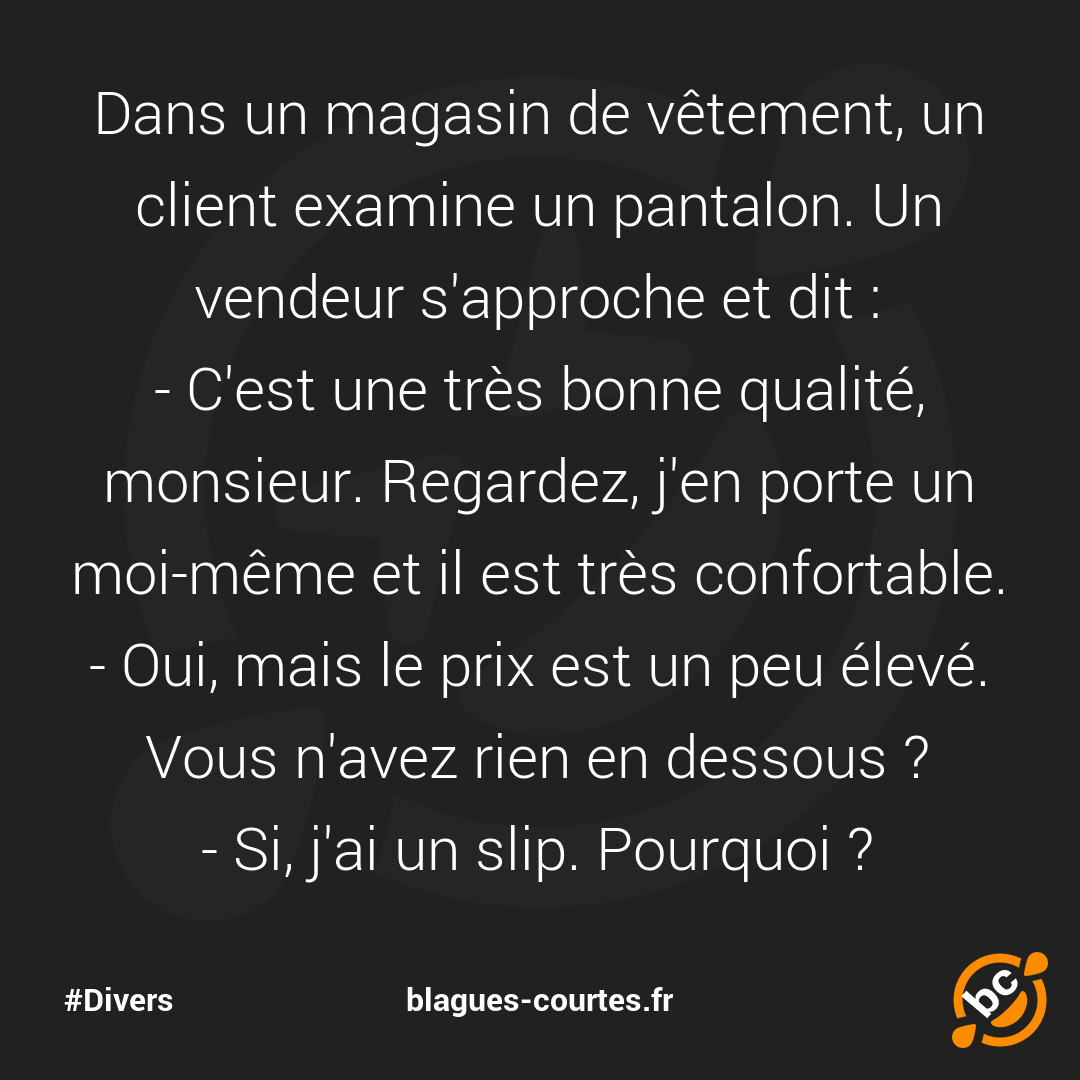 Dans un magasin de vêtement, un client examine un pantalon. Un vendeur s'approche et dit :