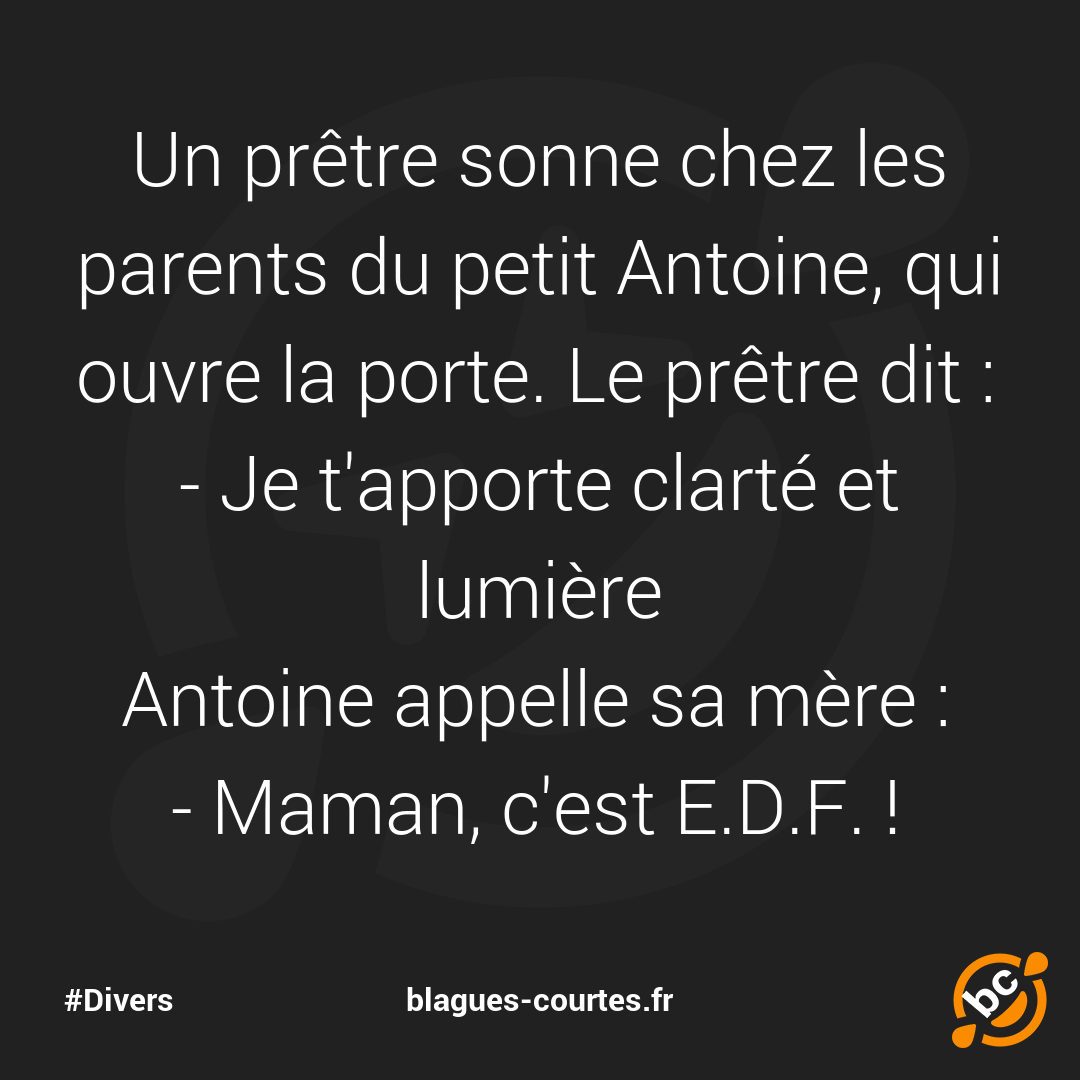 Un prêtre sonne chez les parents du petit Antoine, qui ouvre la porte. Le prêtre dit :