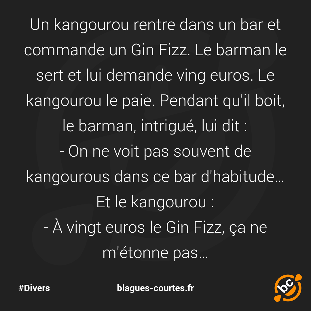 Un kangourou rentre dans un bar et commande un Gin Fizz. Le barman le sert et lui demande ving euros. Le kangourou le paie. Pendant qu'il boit, le barman, intrigué, lui dit :