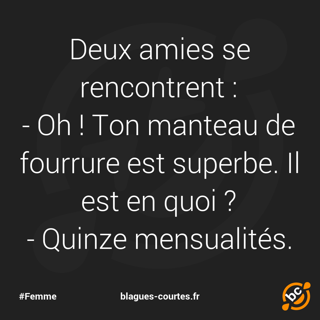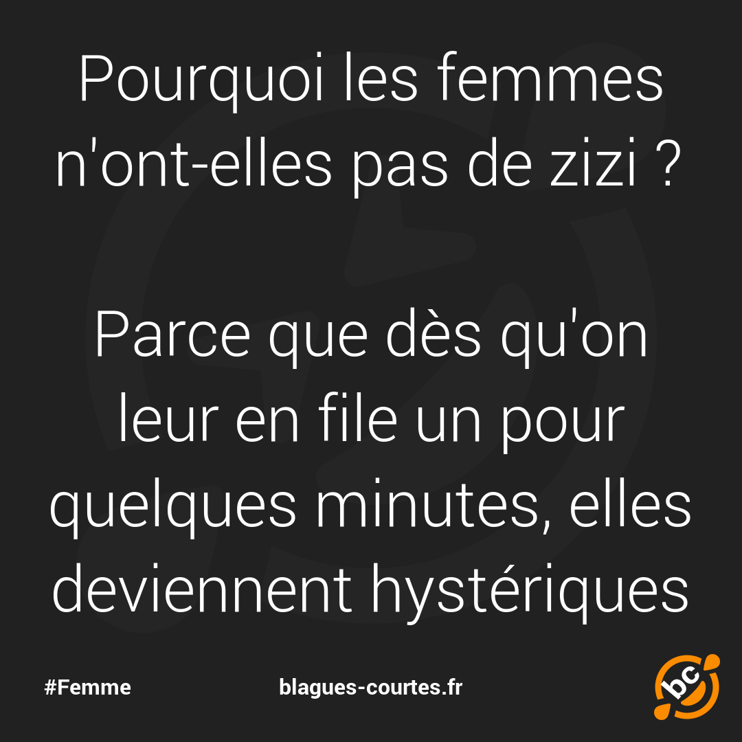 Dans cette section, nous avons rassemblé des blagues courtes qui mettent à l'honneur les femmes et les situations amusantes qu'elles vivent au quotidien. L'humour est un excellent moyen de célébrer la diversité et la richesse des expériences féminines, et ces blagues sont conçues pour provoquer des sourires et des éclats de rire. Que ce soit en se moquant gentiment des clichés ou en relatant des moments cocasses, nous espérons que ces blagues vous divertiront et vous feront passer un bon moment. Préparez-vous à découvrir des blagues qui capturent l'esprit et la vivacité de la vie quotidienne des femmes.