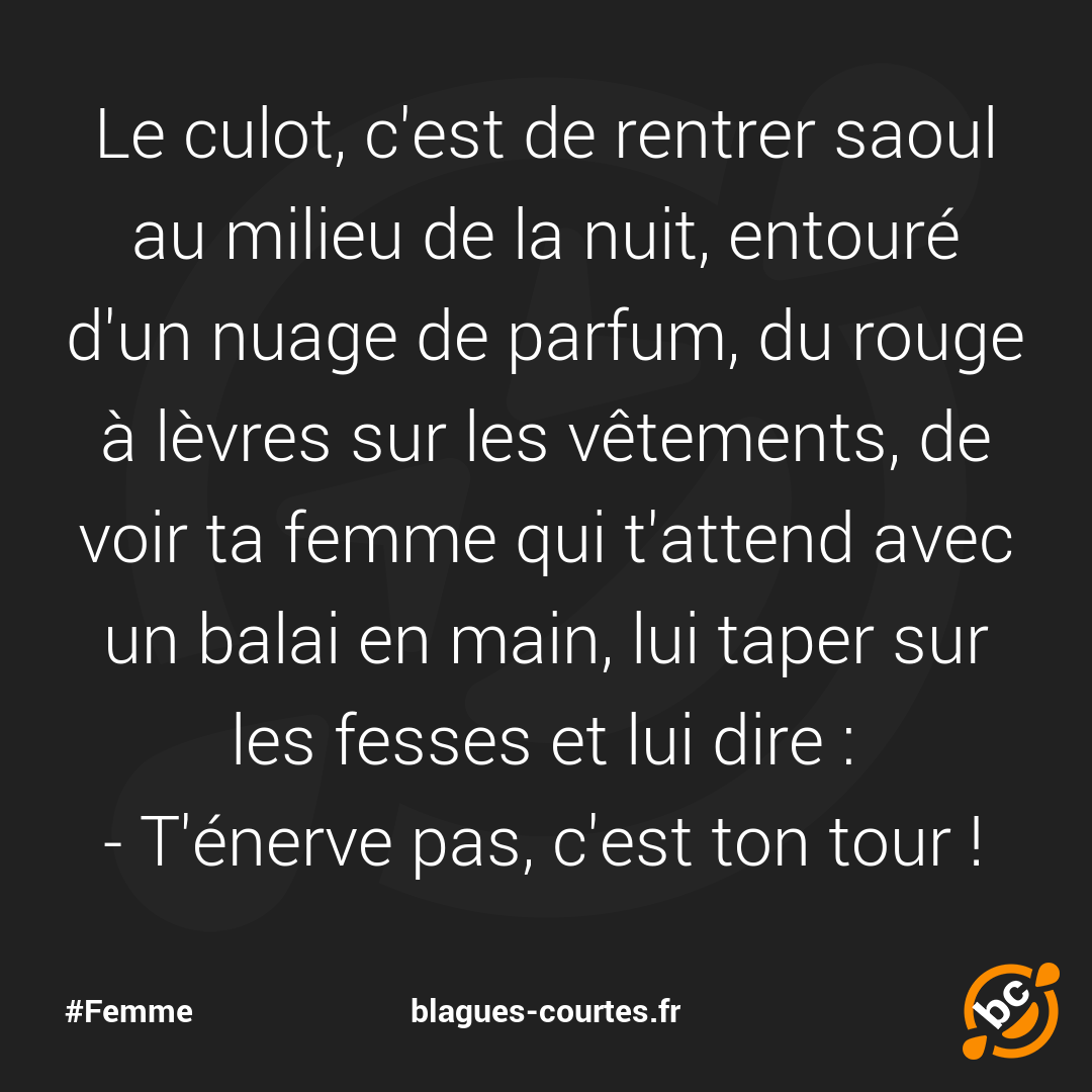 Le culot, c'est de rentrer saoul au milieu de la nuit, entouré d'un nuage de parfum, du rouge à lèvres sur les vêtements, de voir ta femme qui t'attend avec un balai en main, lui taper sur les fesses et lui dire :
