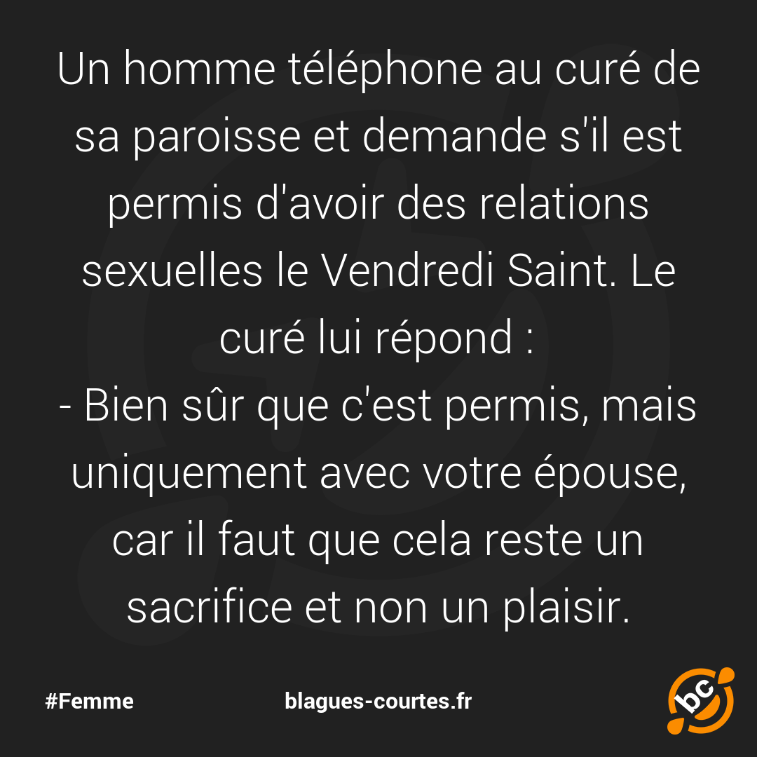 Un homme téléphone au curé de sa paroisse et demande s'il est permis d'avoir des relations sexuelles le Vendredi Saint. Le curé lui répond :