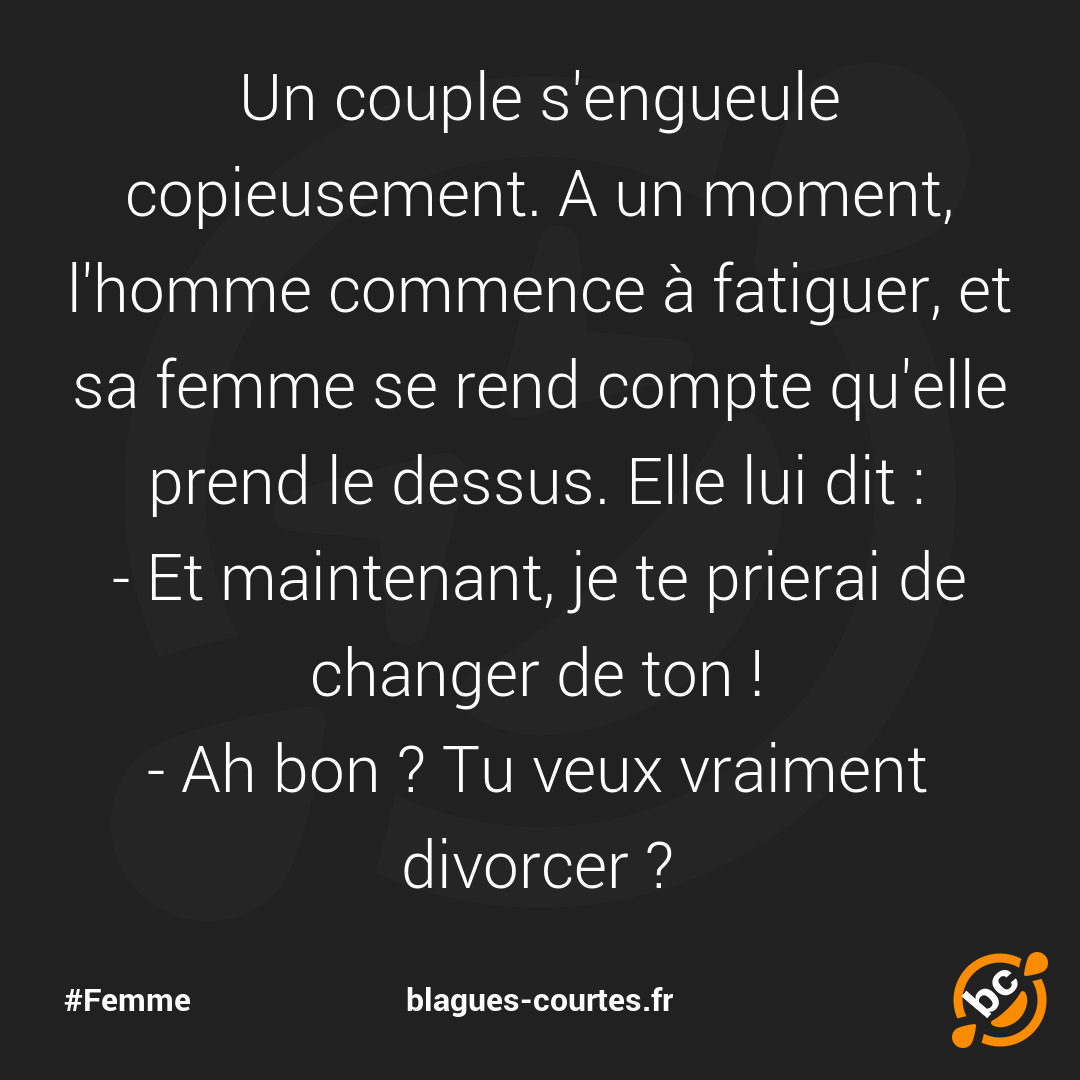Un couple s'engueule copieusement. A un moment, l'homme commence à fatiguer, et sa femme se rend compte qu'elle prend le dessus. Elle lui dit :