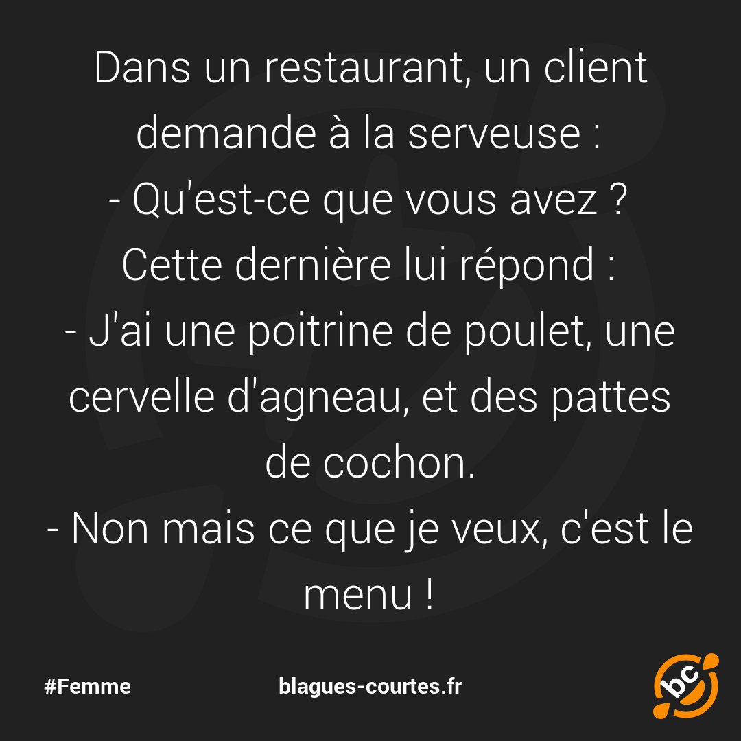 Dans cette section, nous avons rassemblé des blagues courtes qui mettent à l'honneur les femmes et les situations amusantes qu'elles vivent au quotidien. L'humour est un excellent moyen de célébrer la diversité et la richesse des expériences féminines, et ces blagues sont conçues pour provoquer des sourires et des éclats de rire. Que ce soit en se moquant gentiment des clichés ou en relatant des moments cocasses, nous espérons que ces blagues vous divertiront et vous feront passer un bon moment. Préparez-vous à découvrir des blagues qui capturent l'esprit et la vivacité de la vie quotidienne des femmes.