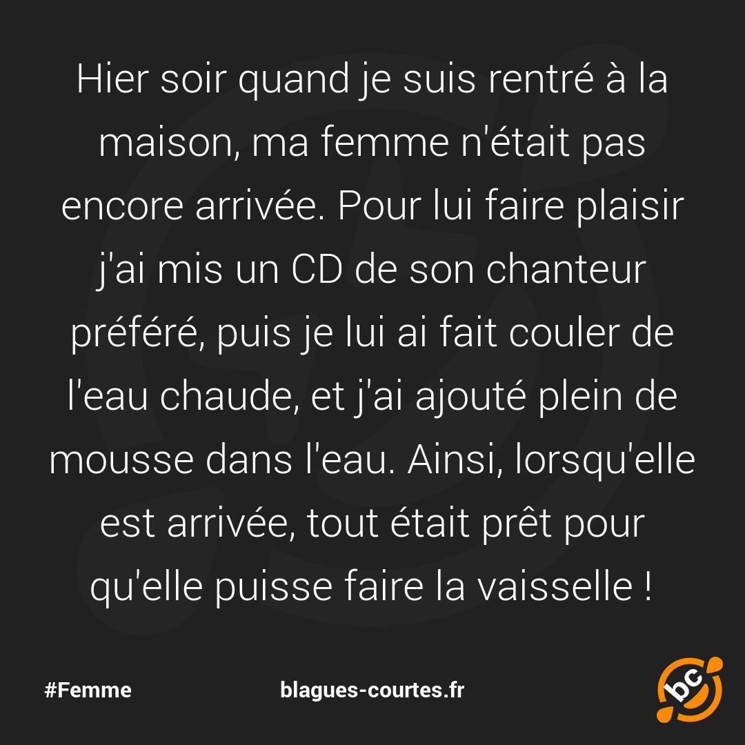 Hier soir quand je suis rentré à la maison, ma femme n'était pas encore arrivée. Pour lui faire plaisir j'ai mis un CD de son chanteur préféré, puis je lui ai fait couler de l'eau chaude, et j'ai ajouté plein de mousse dans l'eau. Ainsi, lorsqu'elle est arrivée, tout était prêt pour qu'elle puisse faire la vaisselle !