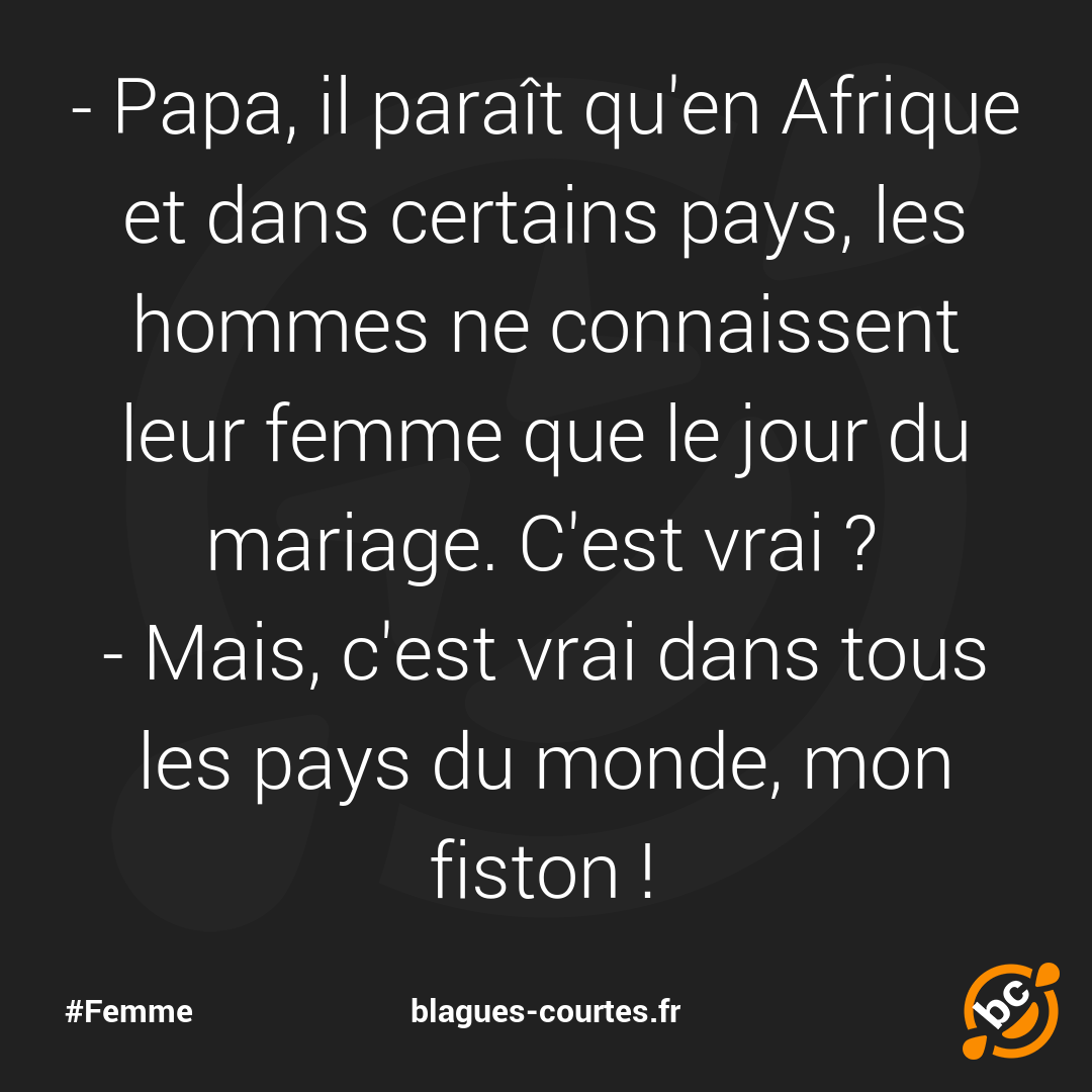 - Papa, il paraît qu'en Afrique et dans certains pays, les hommes ne connaissent leur femme que le jour du mariage. C'est vrai ?