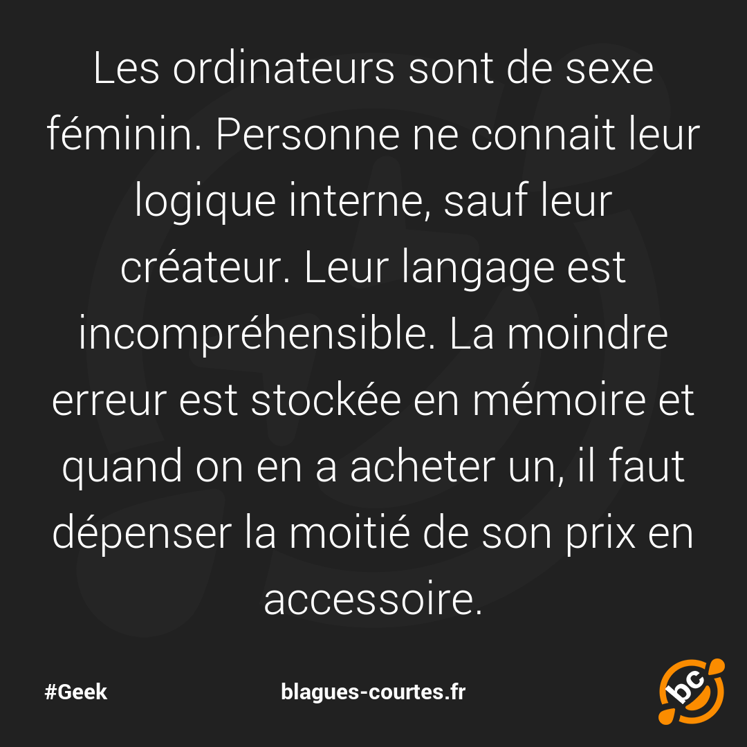 Les ordinateurs sont de sexe féminin. Personne ne connait leur logique interne, sauf leur créateur. Leur langage est incompréhensible. La moindre erreur est stockée en mémoire et quand on en a acheter un, il faut dépenser la moitié de son prix en accessoire.
