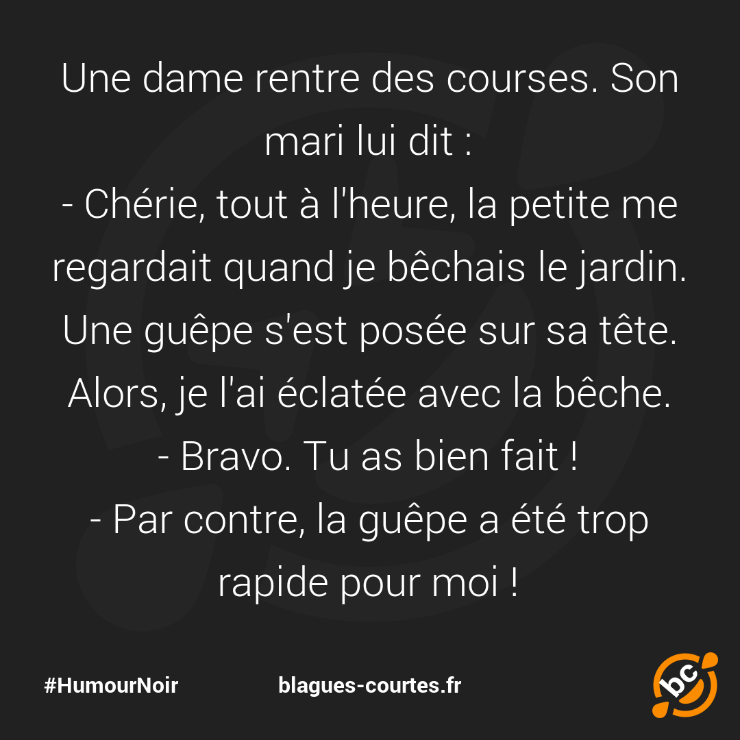 - Chérie, tout à l'heure, la petite me regardait quand je bêchais le jardin. Une guêpe s'est posée sur sa tête. Alors, je l'ai éclatée avec la bêche.