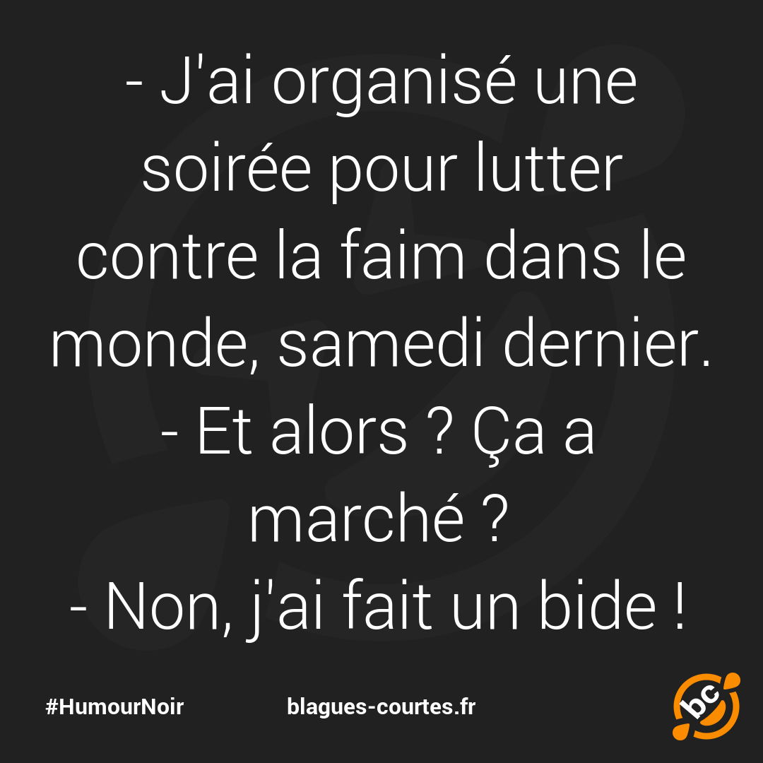 Dans cette section, nous plongeons dans l'univers de l'humour noir, où les blagues courtes prennent une tournure sombre et audacieuse. L'humour noir explore les limites du rire en abordant des sujets tabous et délicats avec une pointe de cynisme. Ces blagues, souvent provocantes, sont conçues pour faire réfléchir tout en amusant. Préparez-vous à découvrir des blagues qui jouent avec les conventions et défient les attentes, tout en vous offrant un moment de rire, même si parfois un peu coupable.