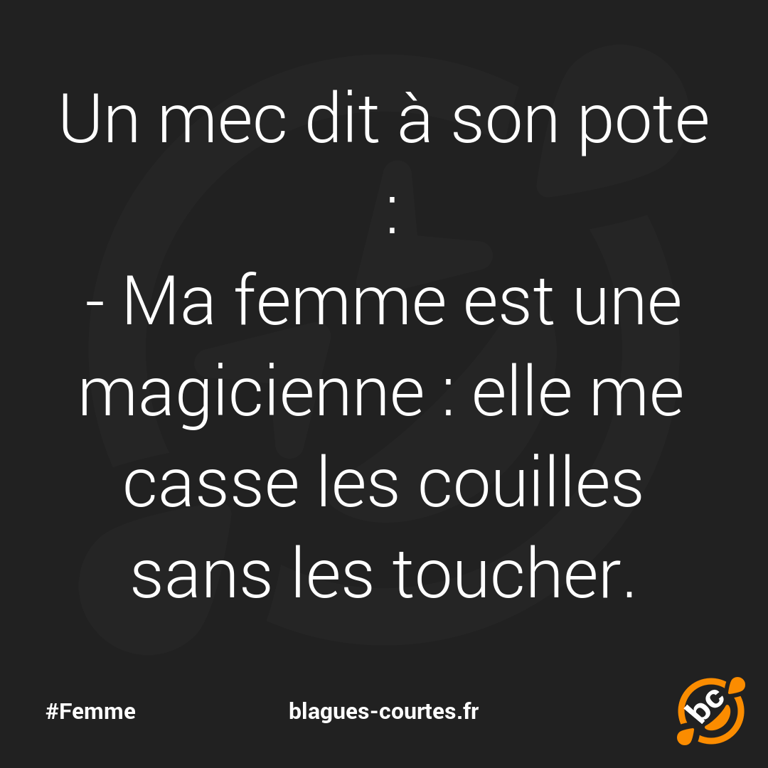 Un mec dit à son pote : - Ma femme est une magicienne : elle me casse les couilles sans les toucher.