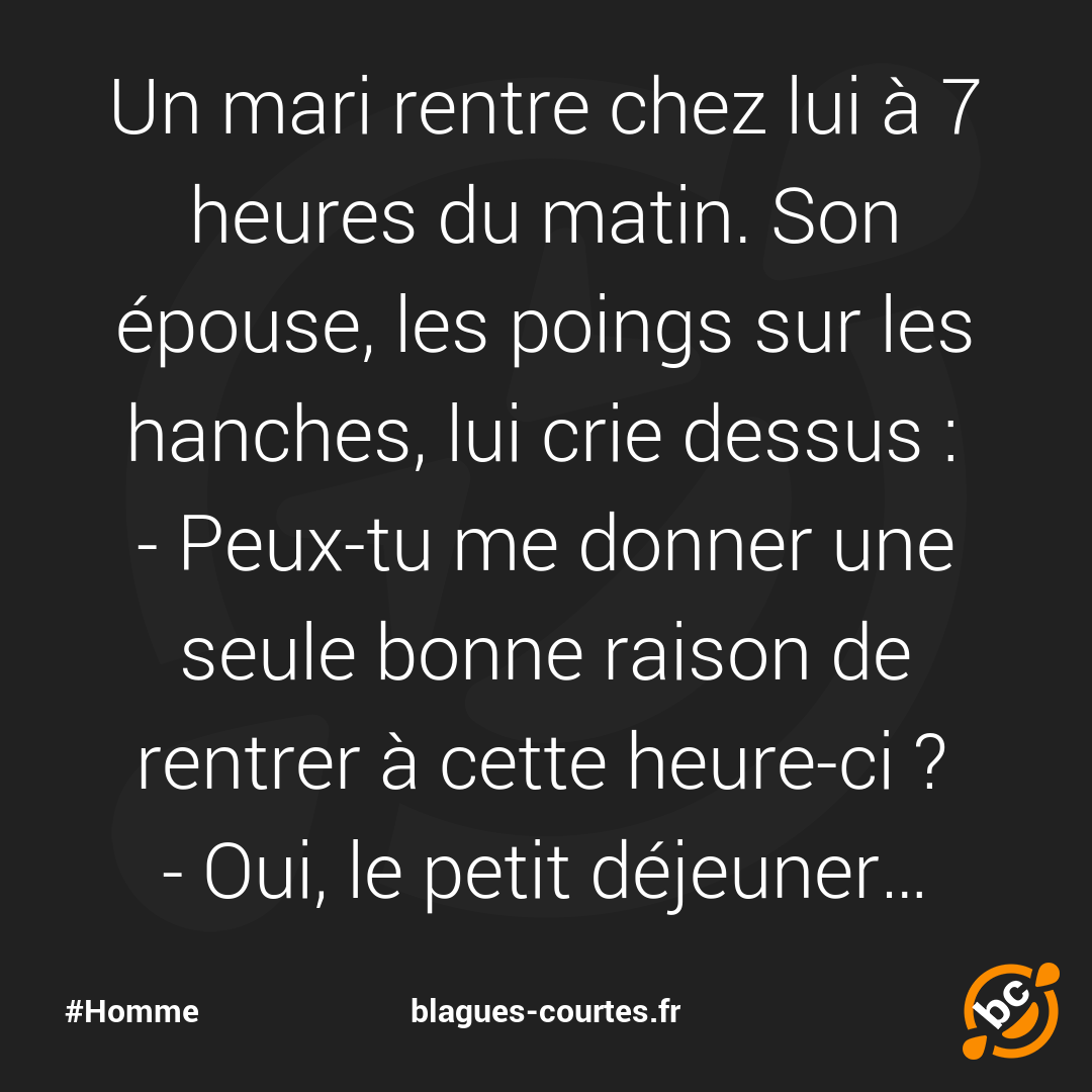 Un mari rentre chez lui à 7 heures du matin. Son épouse, les poings sur les hanches, lui crie dessus :