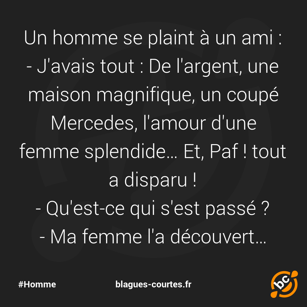 - J'avais tout : De l'argent, une maison magnifique, un coupé Mercedes, l'amour d'une femme splendide… Et, Paf ! tout a disparu !