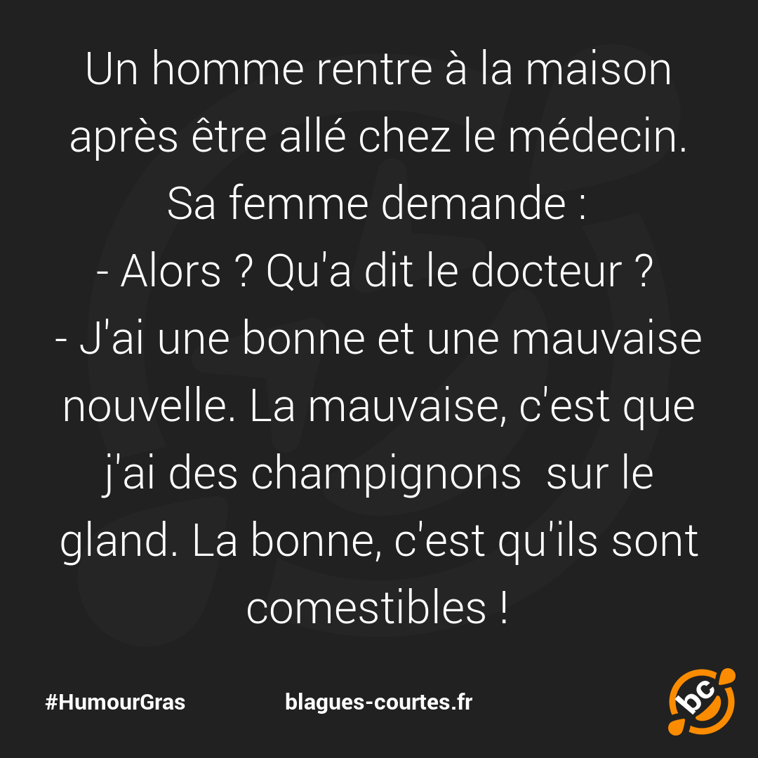 - J'ai une bonne et une mauvaise nouvelle. La mauvaise, c'est que j'ai des champignons sur le gland. La bonne, c'est qu'ils sont comestibles !