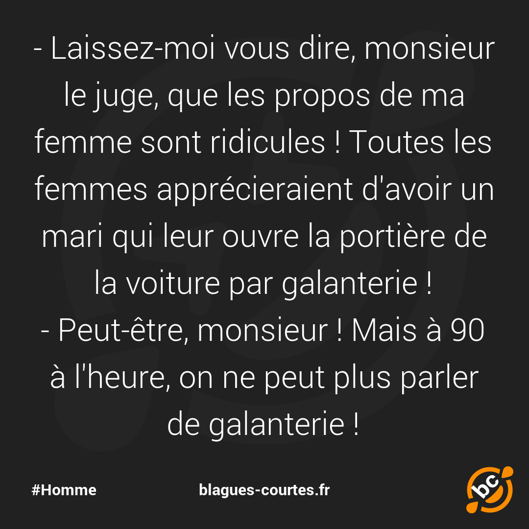 - Laissez-moi vous dire, monsieur le juge, que les propos de ma femme sont ridicules ! Toutes les femmes apprécieraient d'avoir un mari qui leur ouvre la portière de la voiture par galanterie !