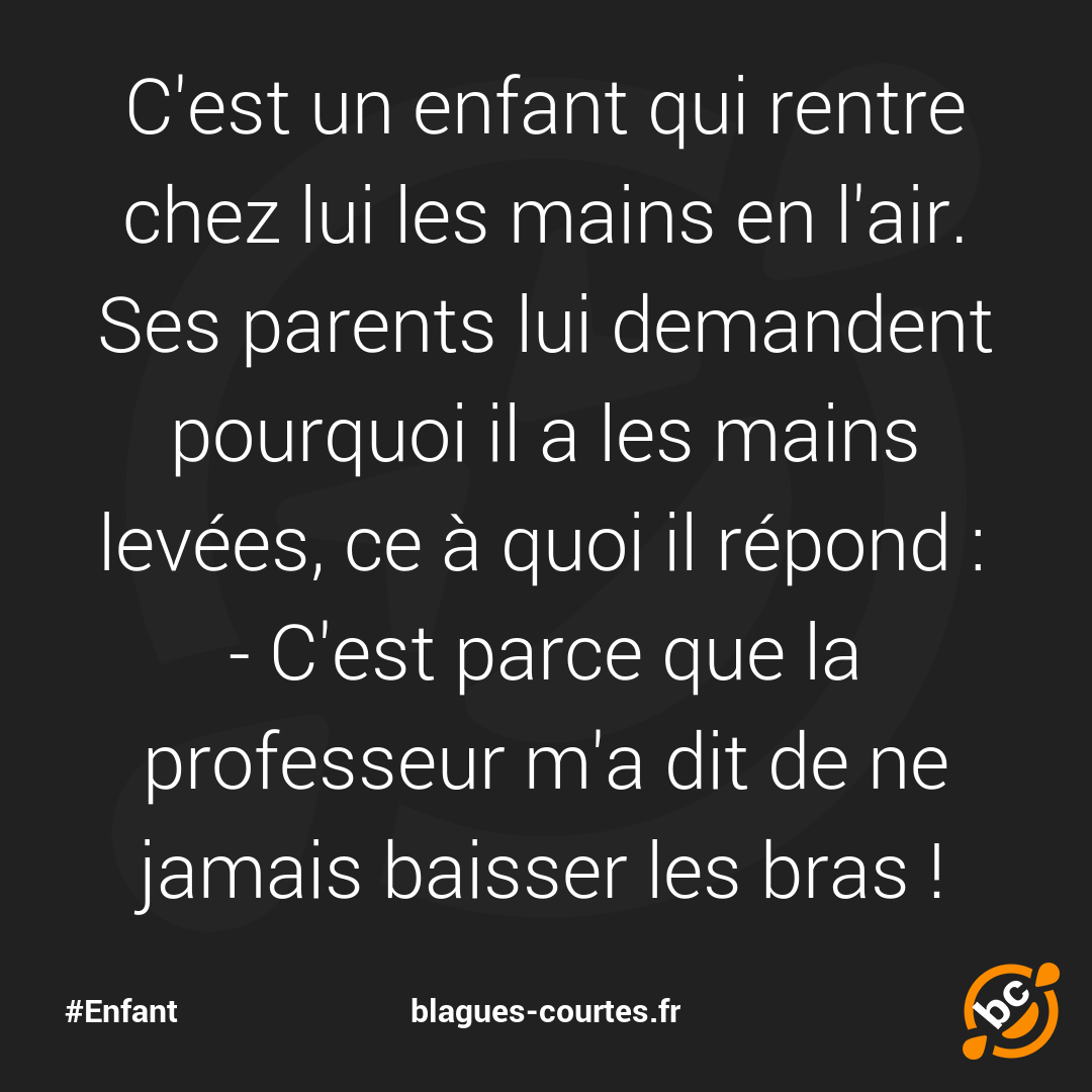 C'est un enfant qui rentre chez lui les mains en l'air. Ses parents lui demandent pourquoi il a les mains levées, ce à quoi il répond :