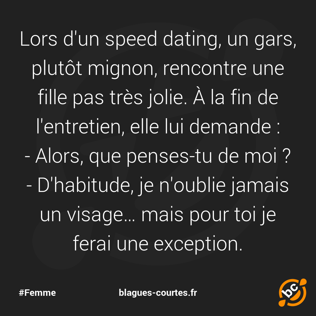 Lors d'un speed dating, un gars, plutôt mignon, rencontre une fille pas très jolie. À la fin de l'entretien, elle lui demande :